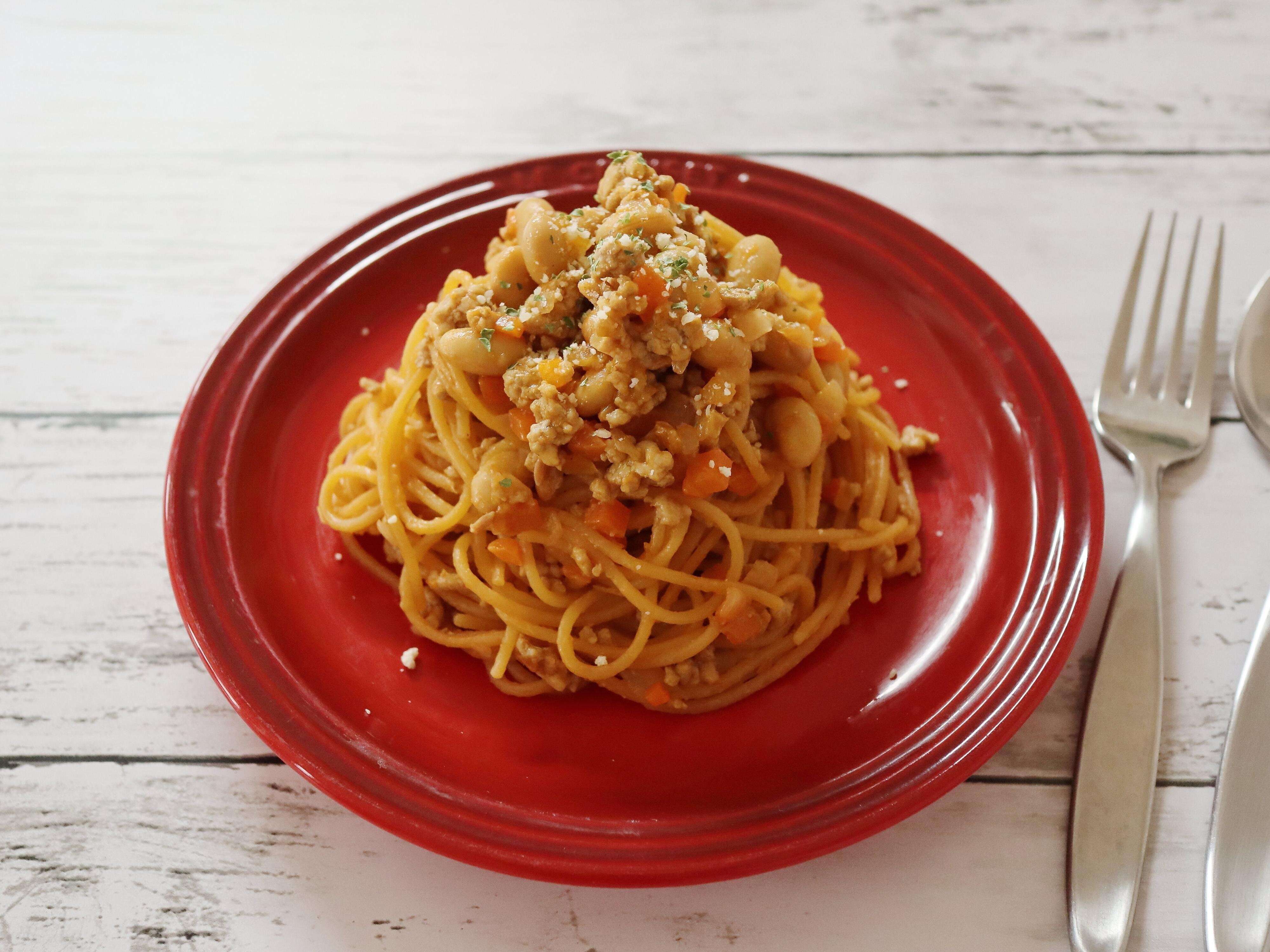 茹でたパスタにポークビーンズを絡めれば、具沢山なミートソースパスタが簡単にできあがります。