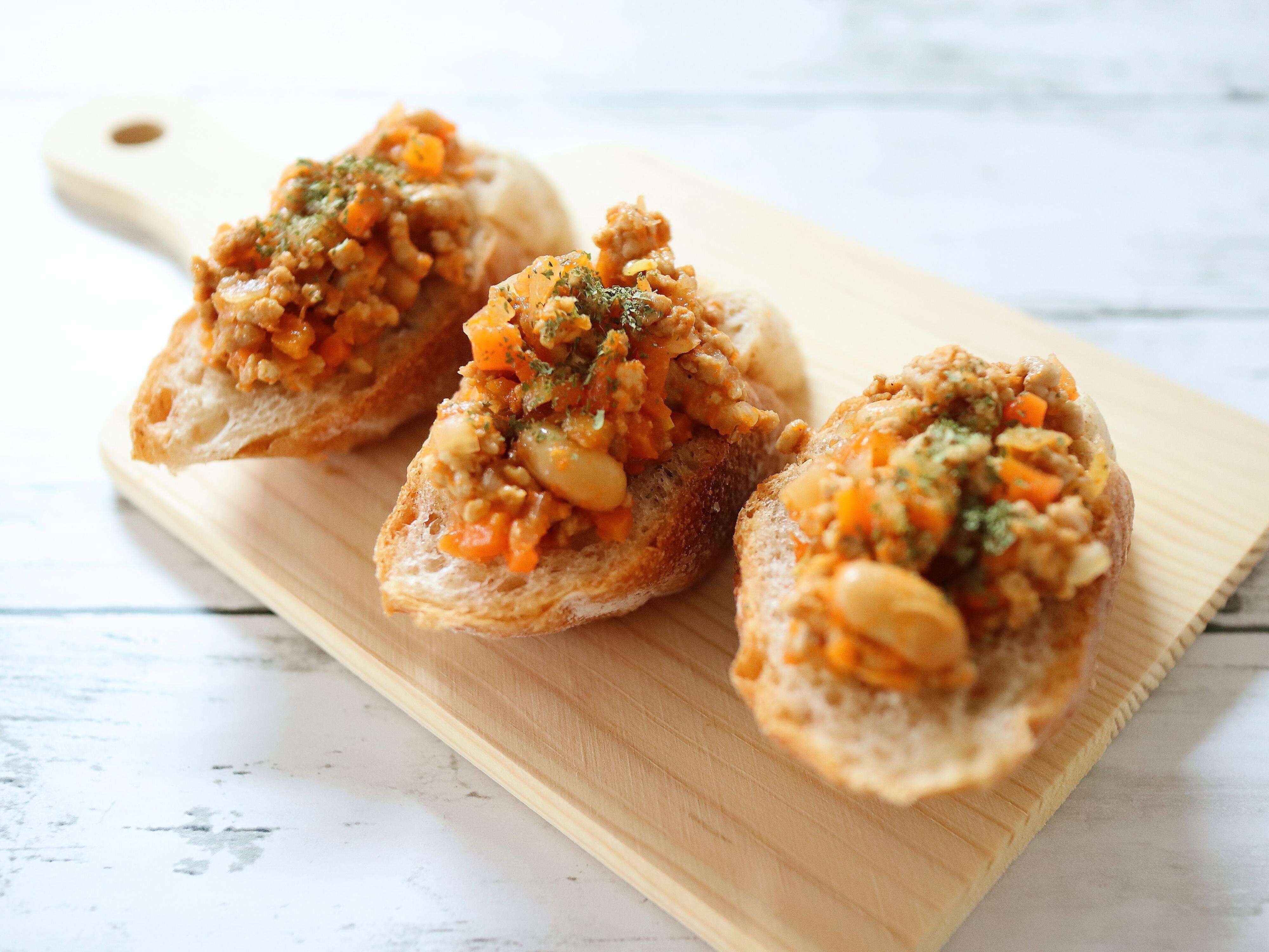 スライスしたバゲットにポークビーンズをのせる簡単アレンジ。