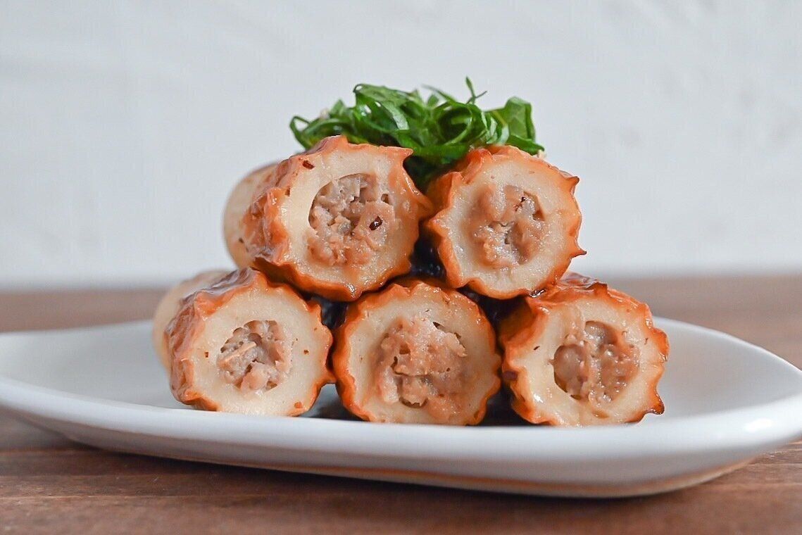 ちくわの穴に肉だねを詰めて加熱するレシピです。