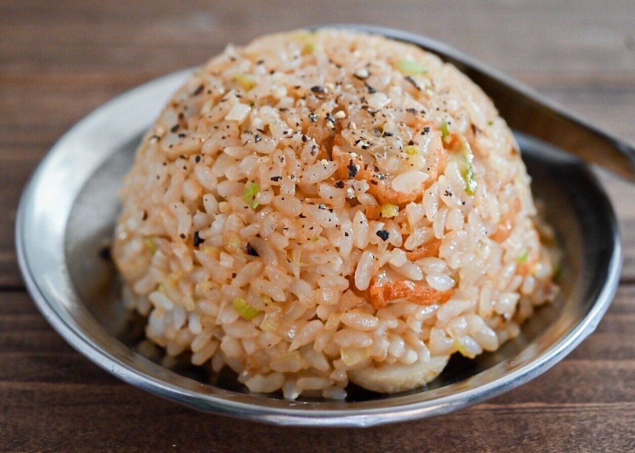 (3)炊いたごはんを加えてほぐしながら加熱する。