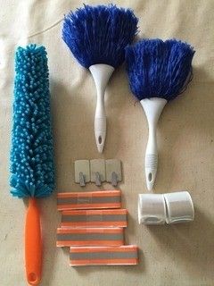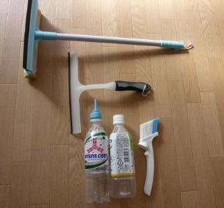 ペットボトルの先端についている水色の先部品とブラシがセットで100円。ペットブラシに水を入れて、窓のサンに水を流しながらこのブラシでサクサクお掃除。快適!