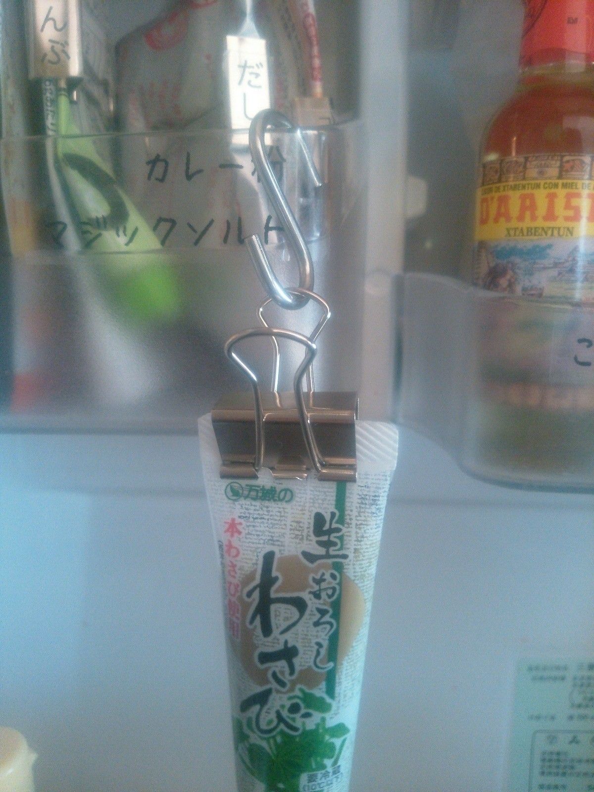 ダブルクリップの輪っか部分は、フックとの相性抜群! michiyoさんはチューブ調味料にクリップをつけ、冷蔵庫にひっかけたS字フックにつるしているそう。使いたいときにすぐ取れて、しかも中身が出し口に常にたまっている、まさにかゆい所に手が届くアイデアです。