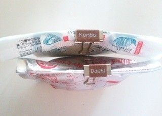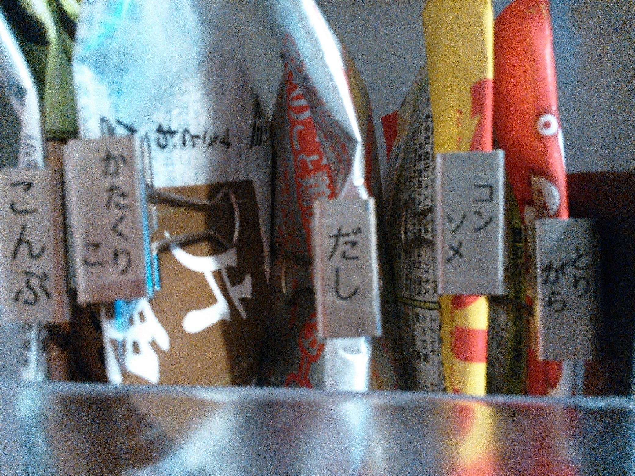 ずぼらワーママのmichiyoさんは調味料を容器に移さず、袋そのものにスプーンを入れて使っているのだとか。そこで保存に使っていたダブルクリップにひと工夫。クリップの背に「だし」などのラベルを貼り、中身を一目瞭然に! 上から見るコンロ下収納でもすぐわかるように横書きで、最初はオシャレに英語表記にしました。