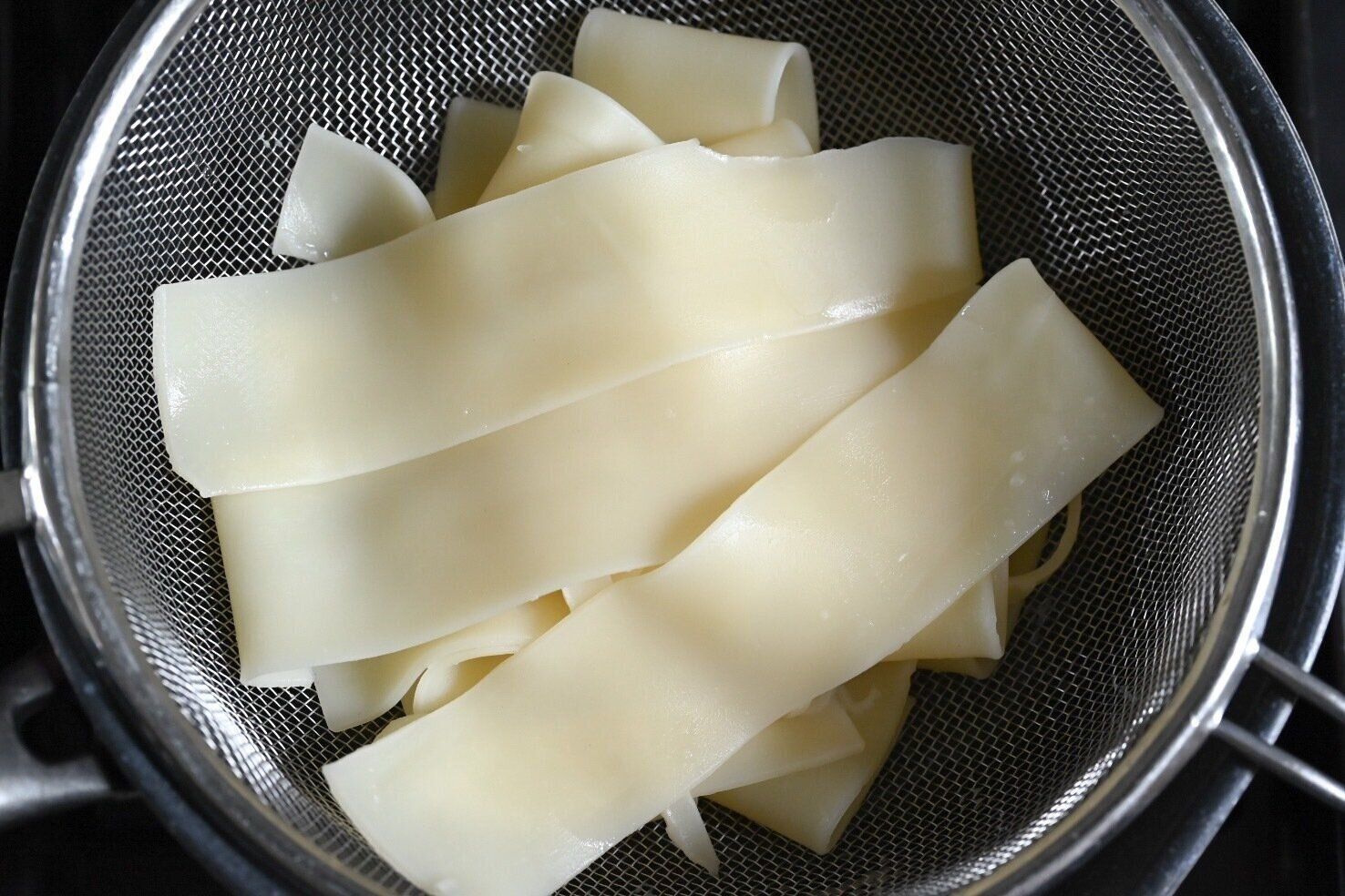 (5)ビャンビャン麺を1本ずつ加え、12分加熱して湯切りする。
