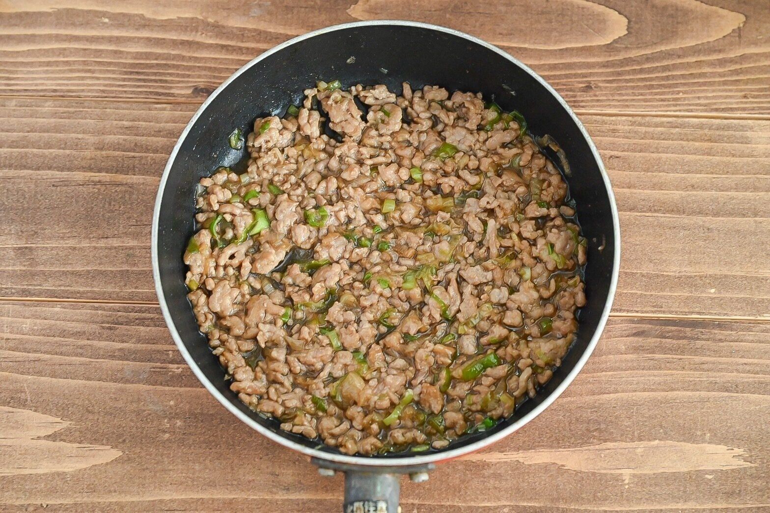 (3)豚ひき肉の色が変わったらみりん、オイスターソースを加え、汁気がなくなるまで加熱する。