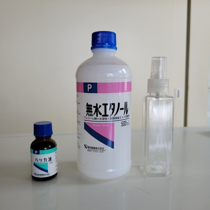 用意するものはハッカ油、無水エタノール10ml、水90ml、スプレー容器。