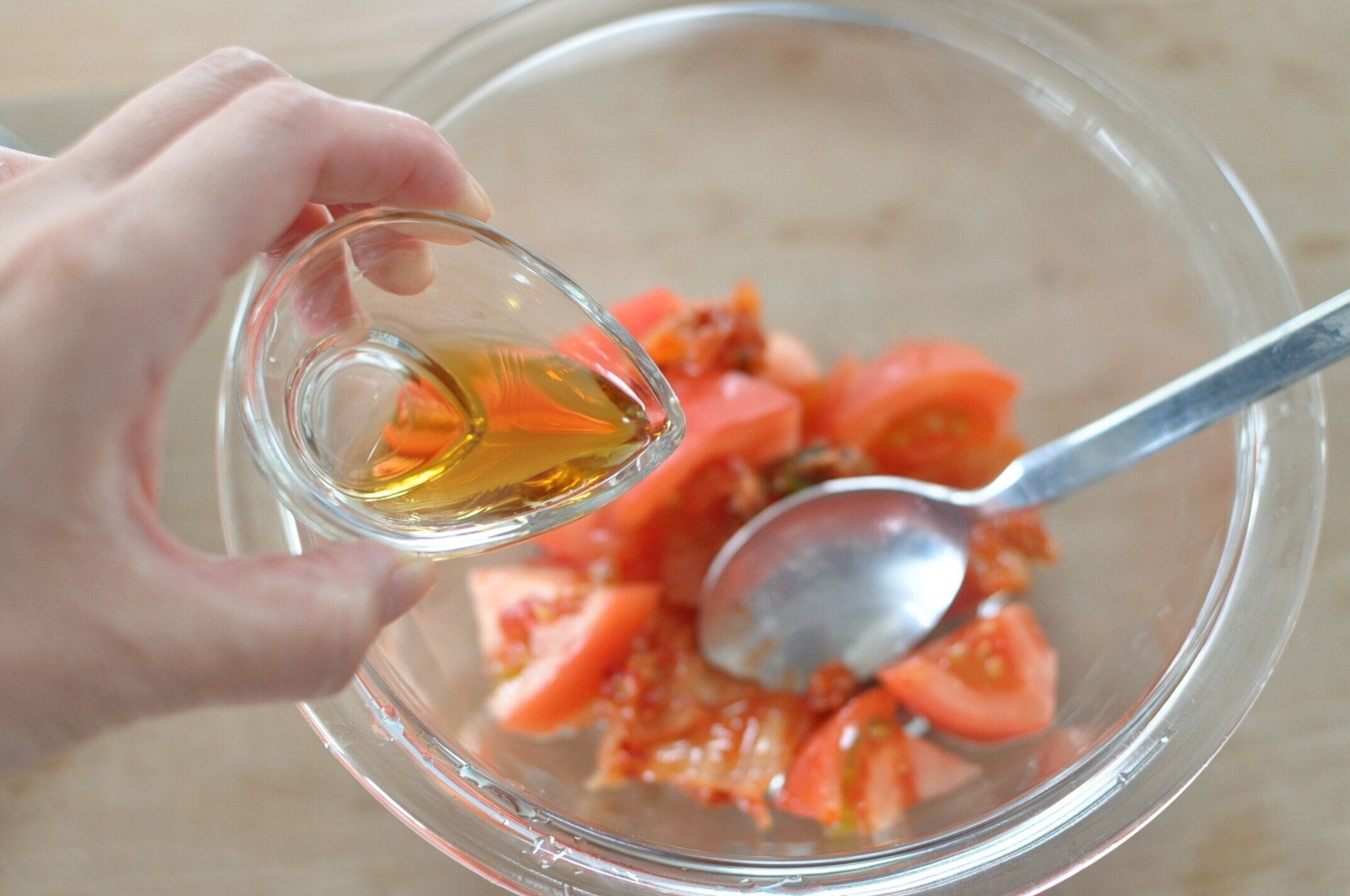 よく混ぜます。トマトから水気が出てきますが、タレになるので気にしなくて大丈夫。