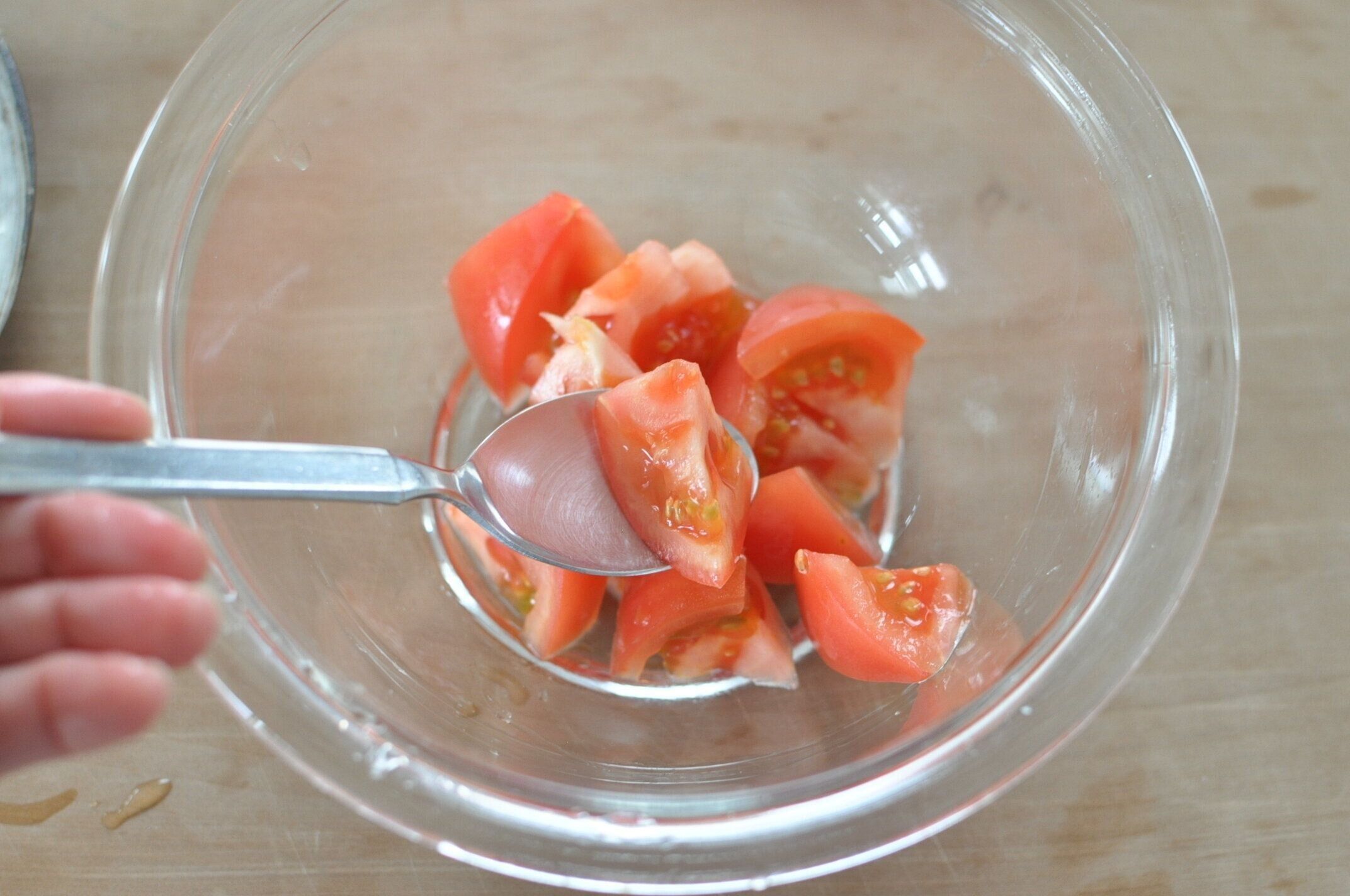 トマトを小さめのひと口大に切ります。豆腐にのせるので、あまり大きいと豆腐といっしょに食べにくいです。