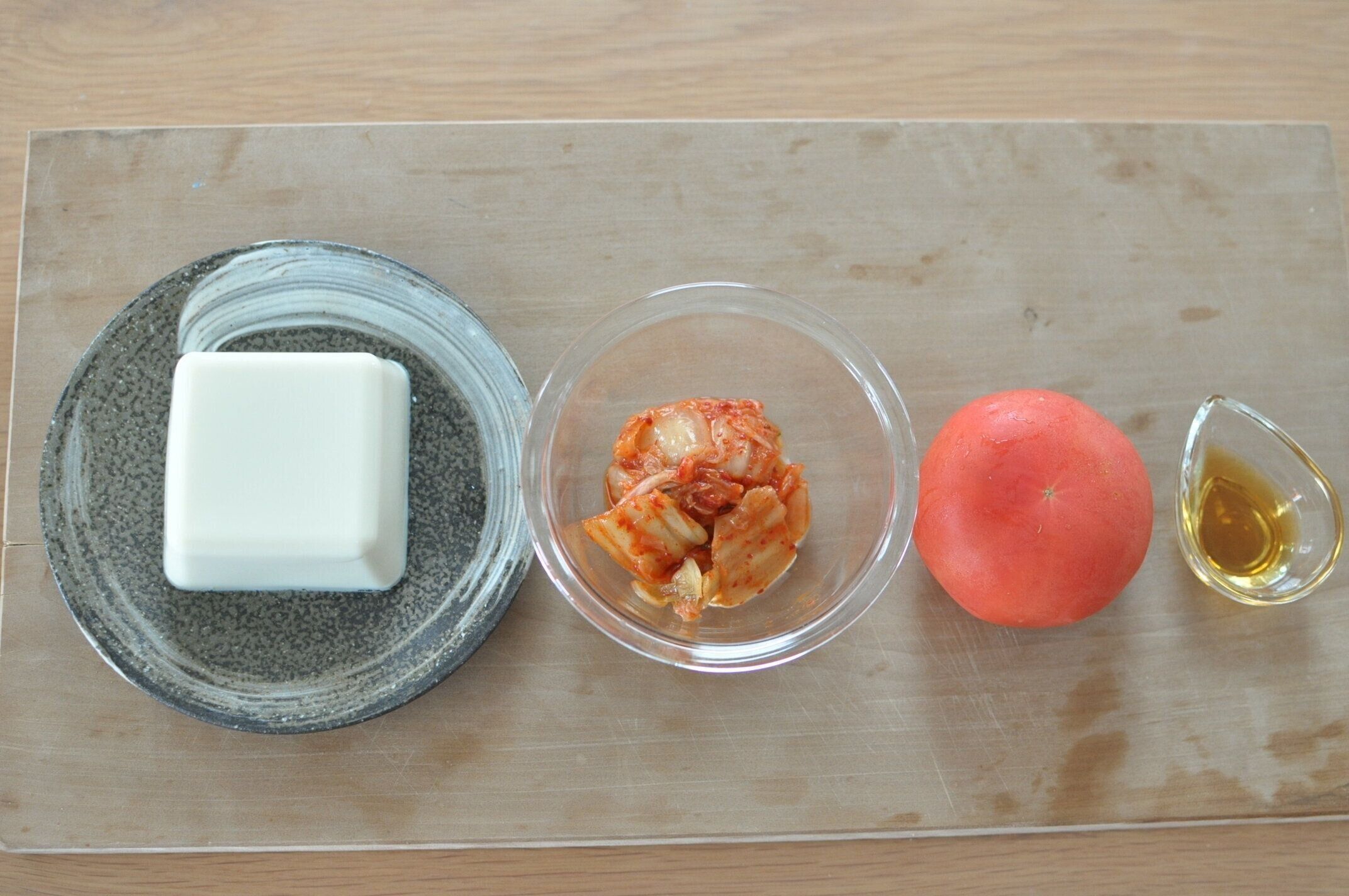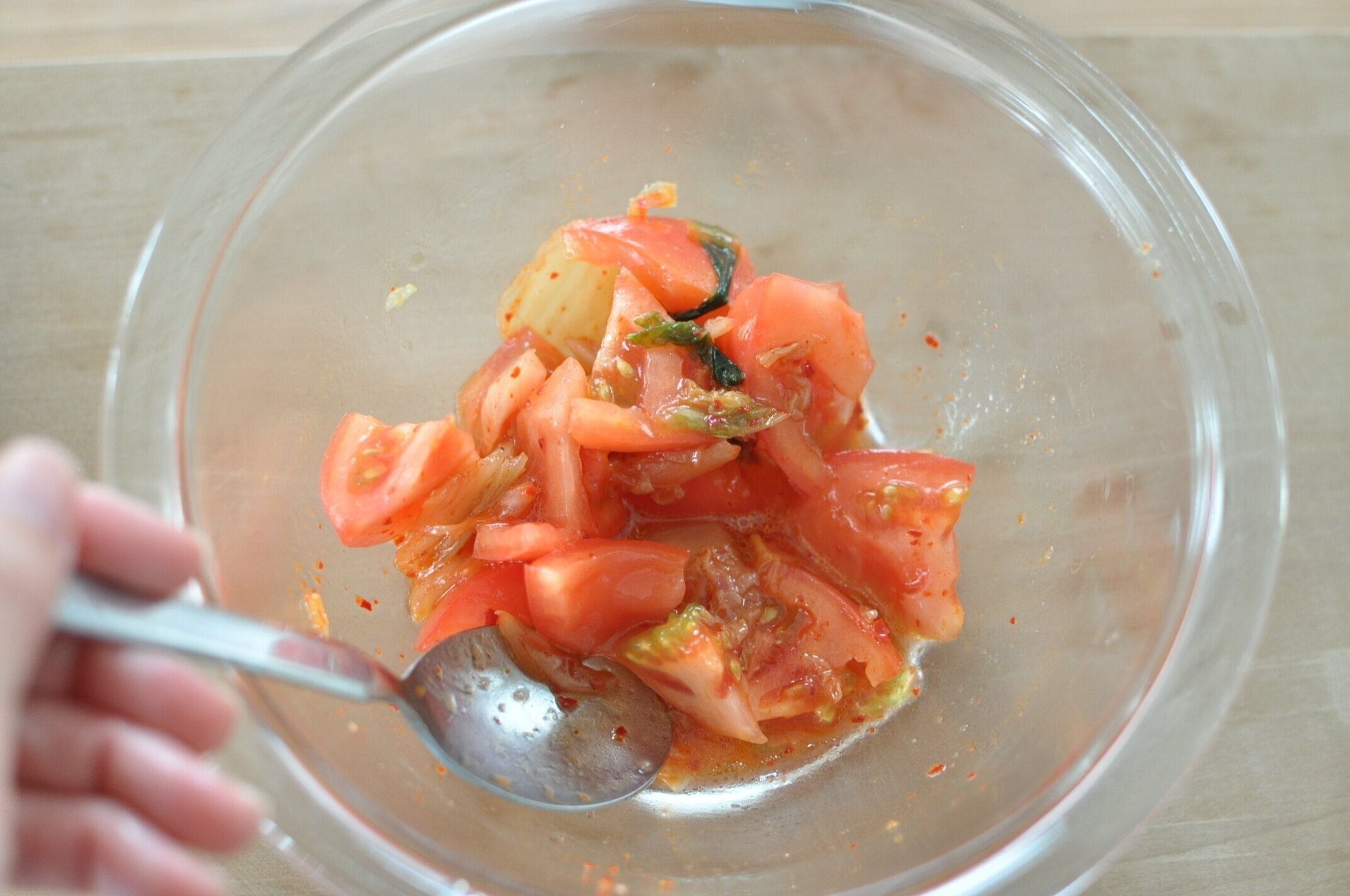 この時点でトマトキムチナムルのできあがりです。このまま食べてもおいしいですが、今回は冷奴にのせていきます。
