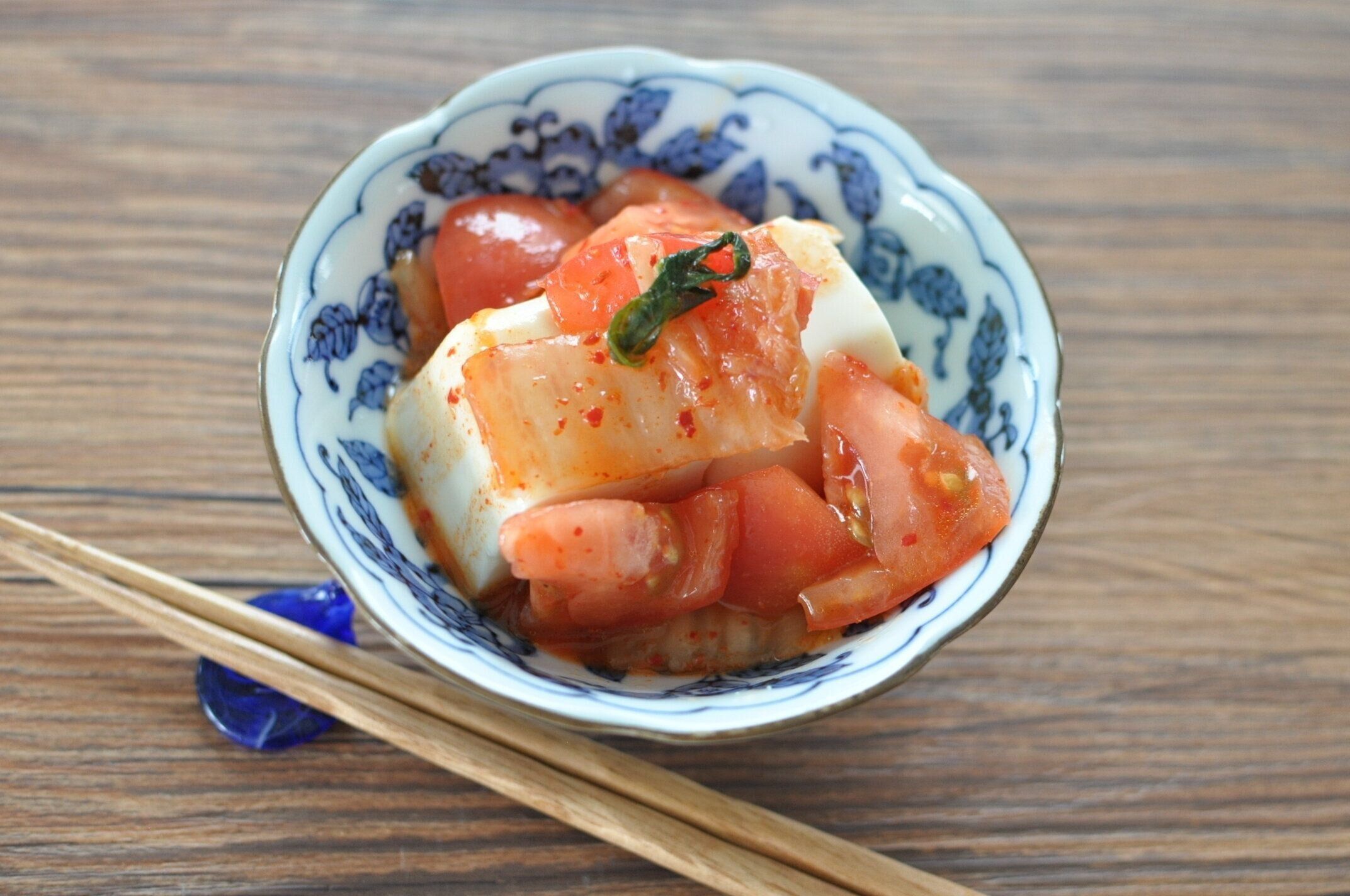 器に豆腐をのせ、トマトキムチナムルをのせます。キムチの味によって、塩気が足りない…と感じたら、少し麺つゆをかけても◎。