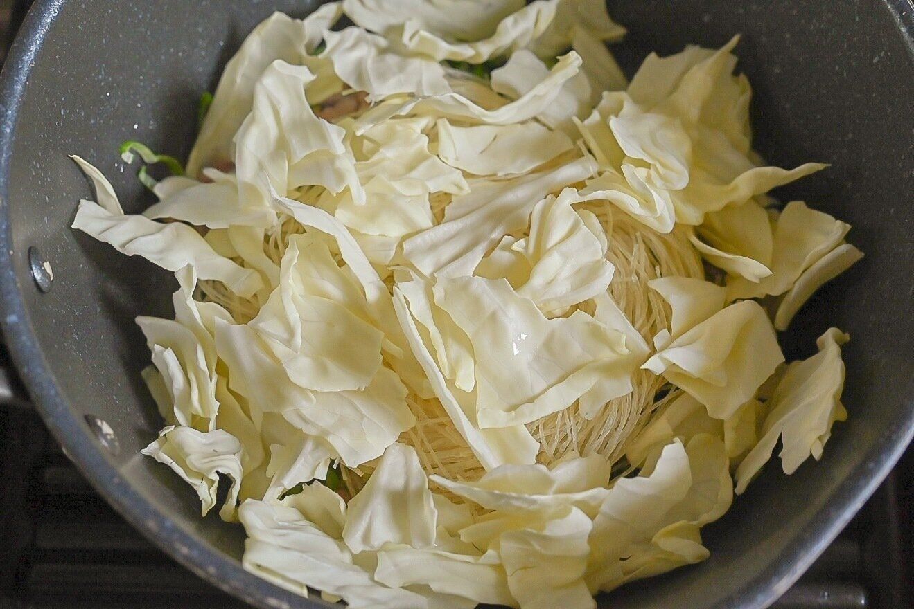 (3)熱したフライパンに、豚こま切れ肉、長ねぎ、ビーフン、キャベツの順に入れる。