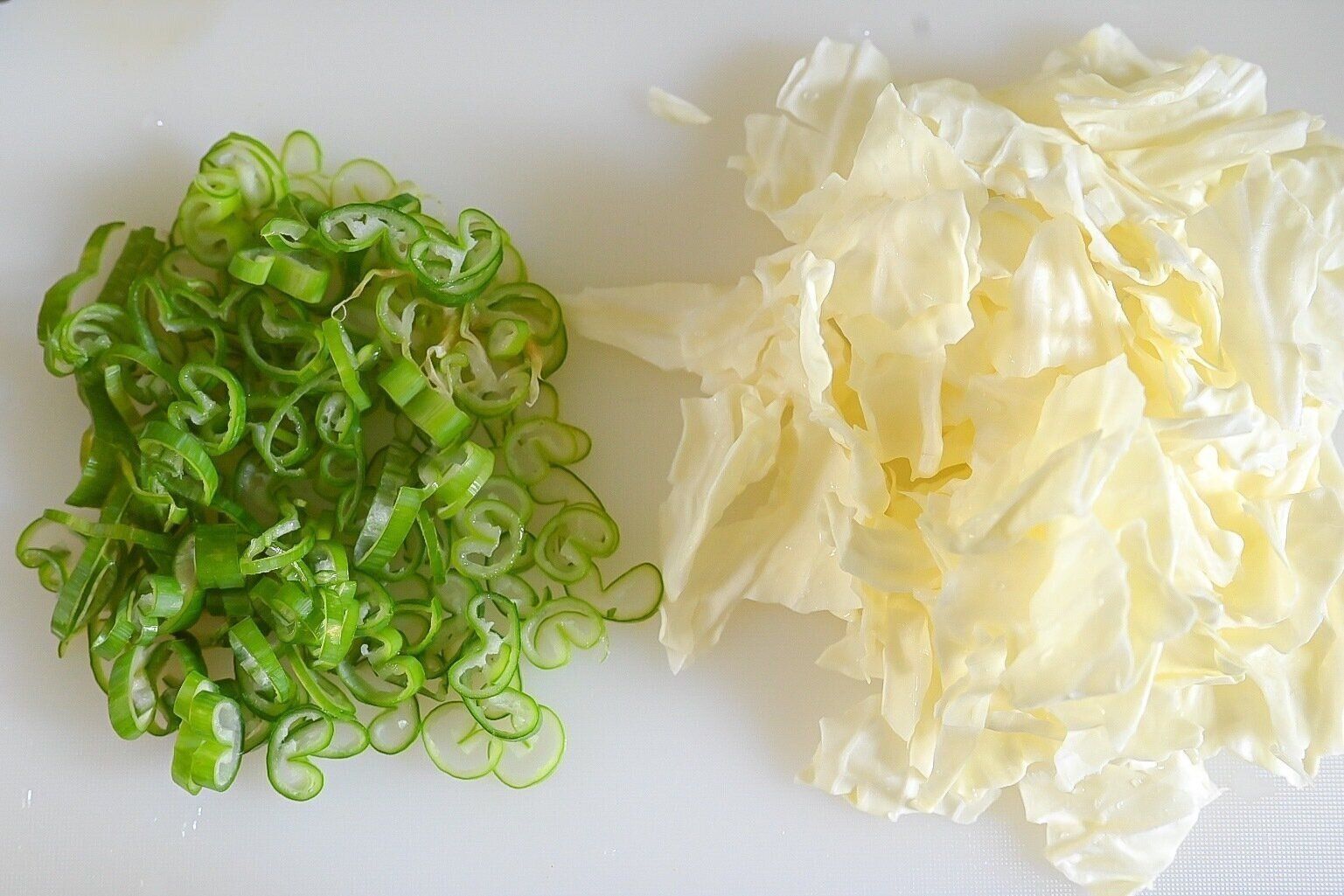 (1)長ねぎを薄切りに、キャベツは食べやすい大きさに切る。