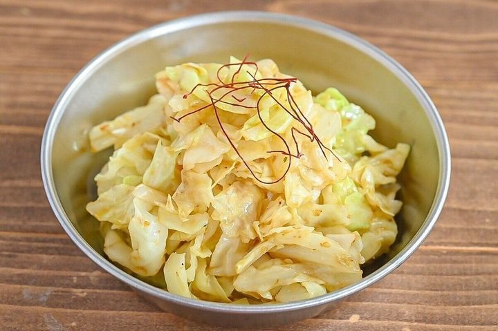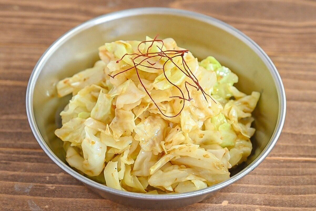 レンジ加熱してかさを減らしたキャベツに「韓国風レモン塩だれ」を和えるひと皿です。