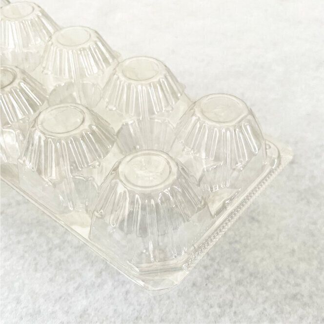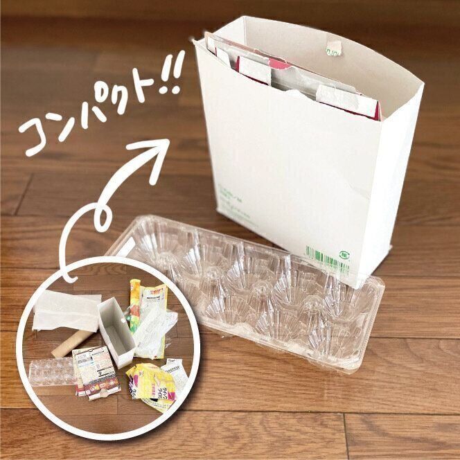 特徴的な卵のパックも上下切り離して重ねるとスッキリします。同じように豆腐や納豆もいくつか使った時は容器を重ねて捨てるようにしています。