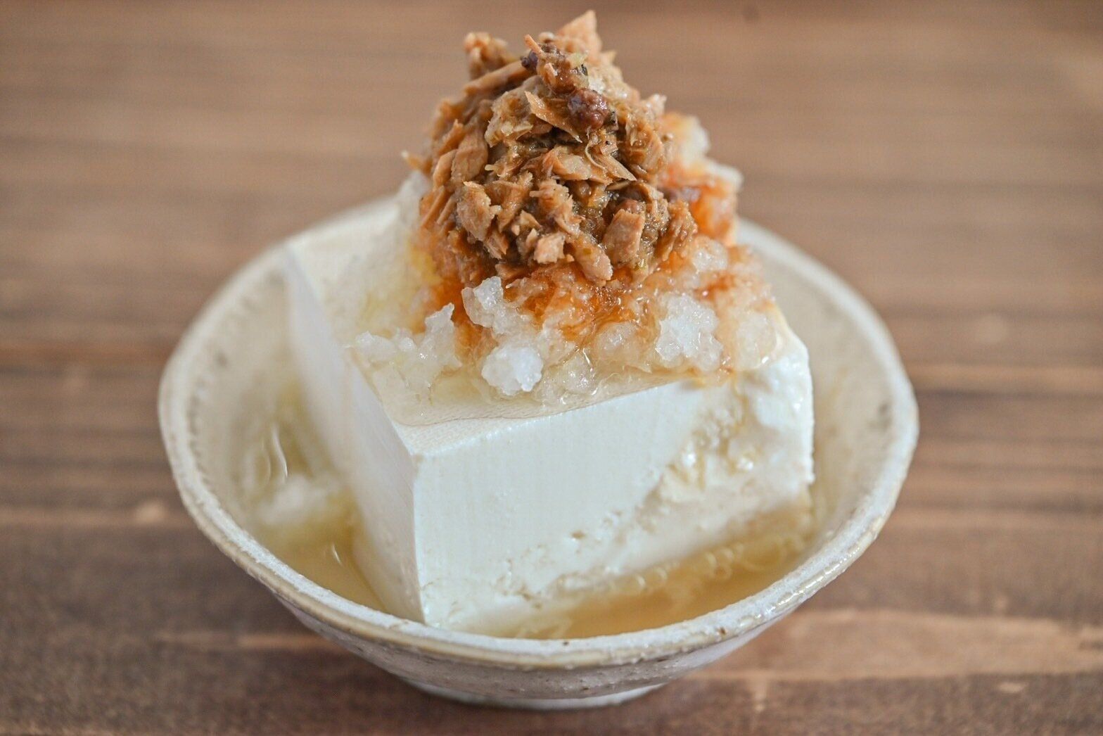 木綿豆腐に大根おろし、「鮪の山椒オイル漬け」をのせ、しょうゆを垂らして完成。