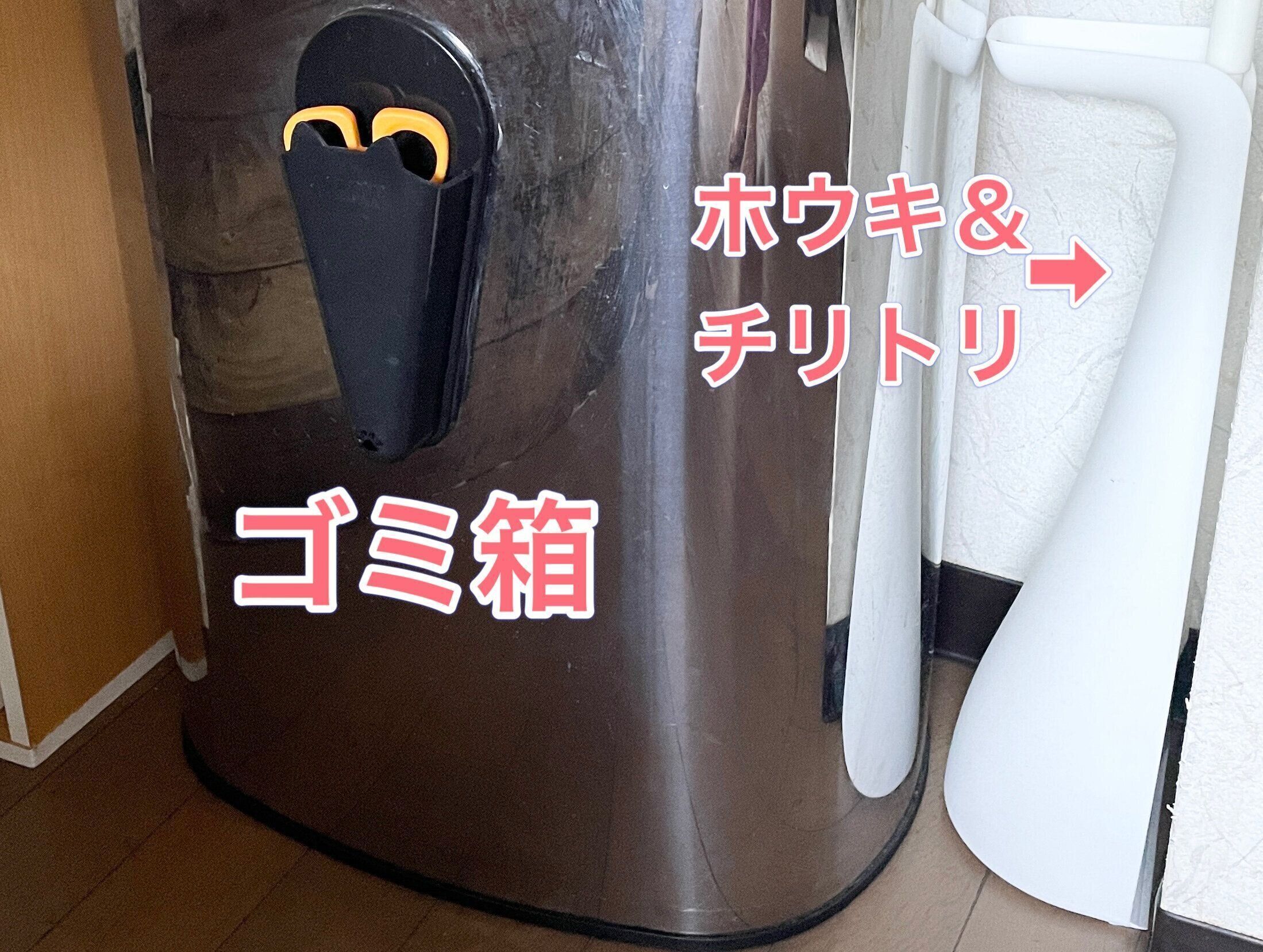 わが家ではゴミ箱の横に、100円ショップのワッツで買ったスリムな「ホウキとチリトリ」のセットを置いていますよ。