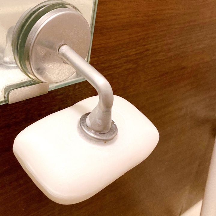 これは石けんに付属の磁石をはめ込んで本体の磁石とくっつけるものなので、石けん自体がつるされた状態になります。そのため受け皿が必要なく掃除がとても楽になりました。