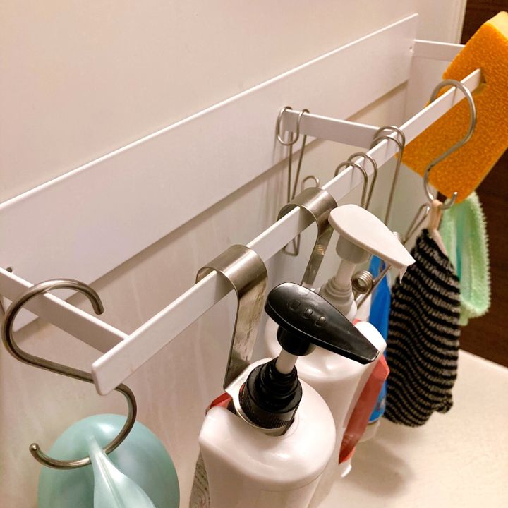 また掃除用のスポンジは直接引っ掛けられるデザインのものを選んだり、ループがついているものを選んでS字フックに引っ掛けてつるしています。