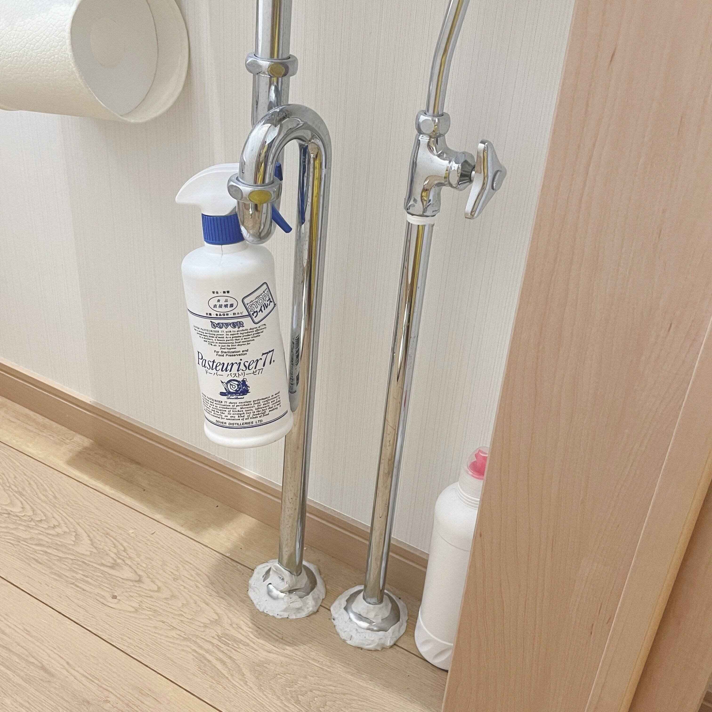 便座周りはアルコール除菌スプレー+トイレットペーパーでカンタンに拭き取ります。