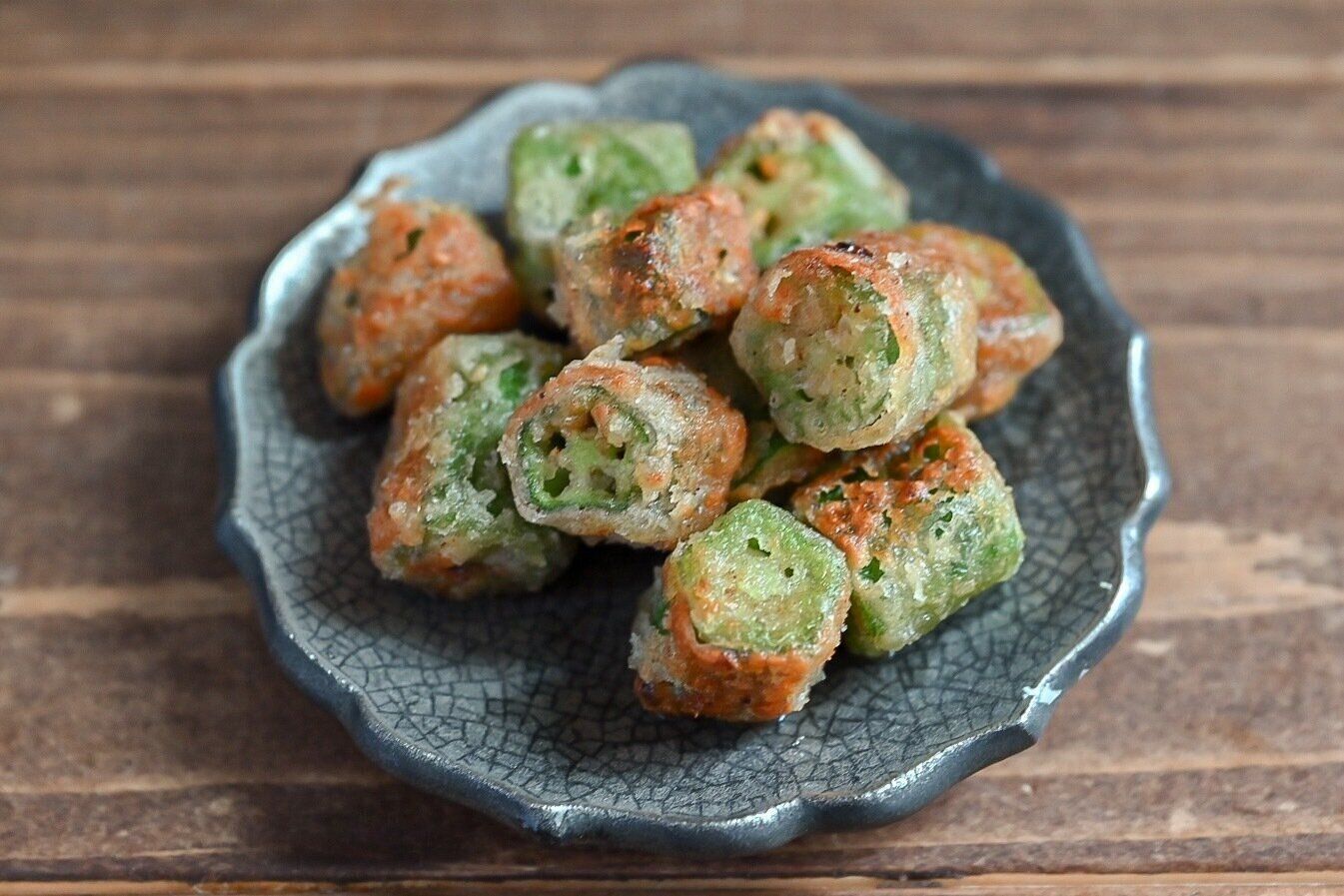(3)フライパンの底から2cmの高さまで揚げ油を入れて中火にかけ、オクラに揚げ色がつくまで加熱して完成。