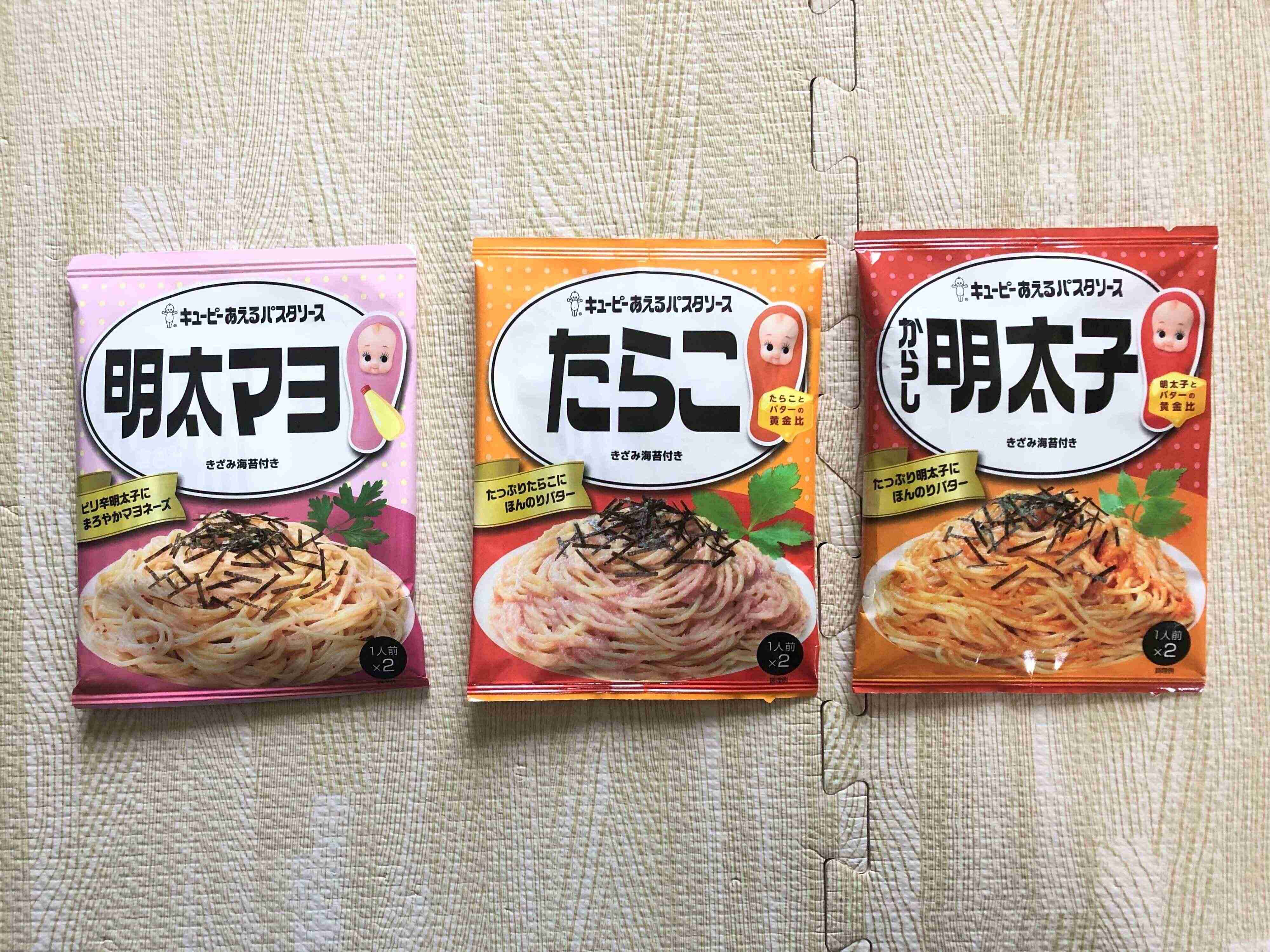おすすめのソースはやっぱり定番のたらこ系。キューピーのあえるパスタソースには「たらこ」「明太マヨ」「からし明太子」の3種類。
