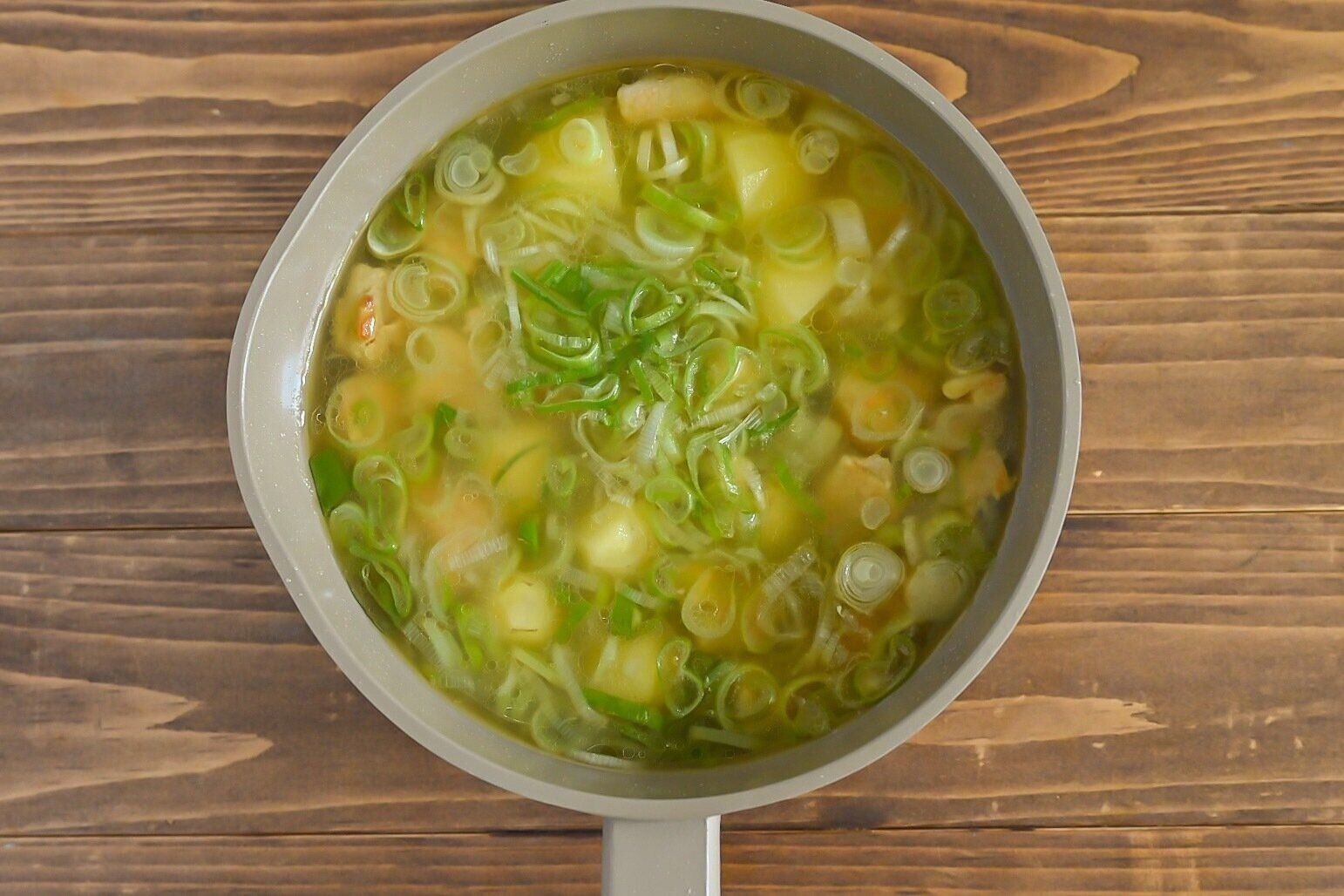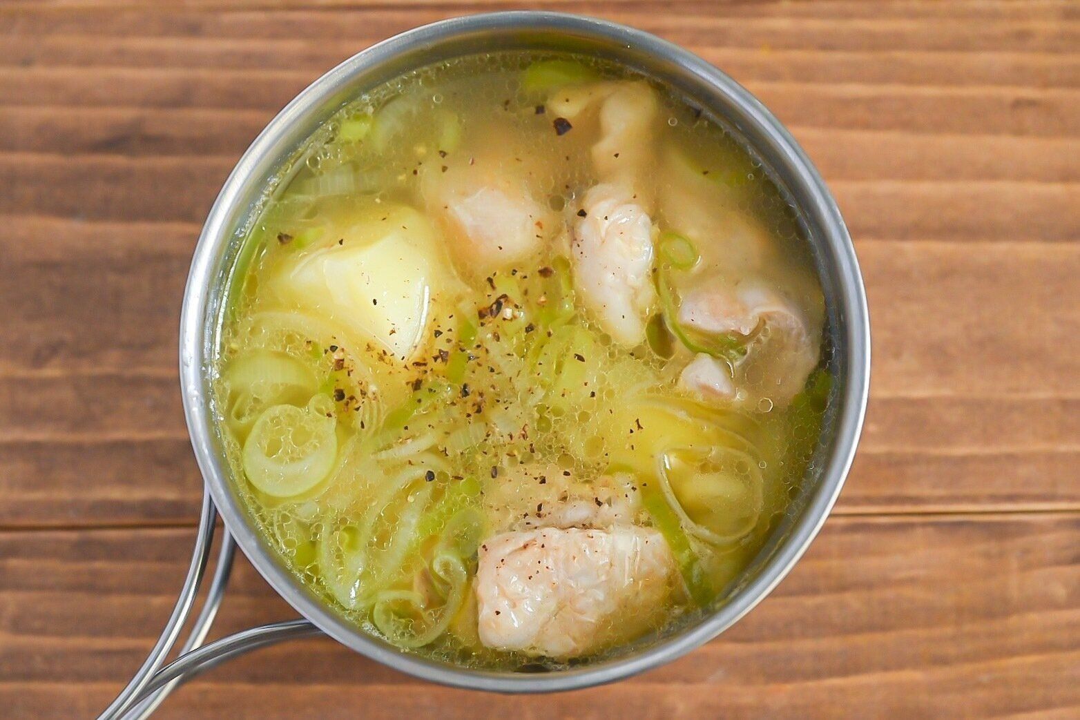 (6)長ねぎ、じゃがいも、タッカンマリの素、水400mlを入れてひと煮たちさせる。