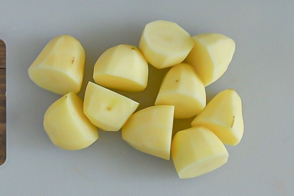 (3)じゃがいもの皮を剥いてひと口大に切る。