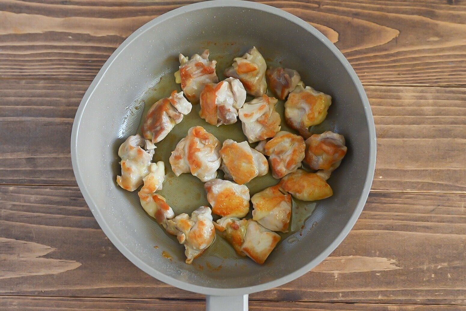 (5)鶏もも肉をひと口大に切り、皮を下にしてフライパンに入れ、