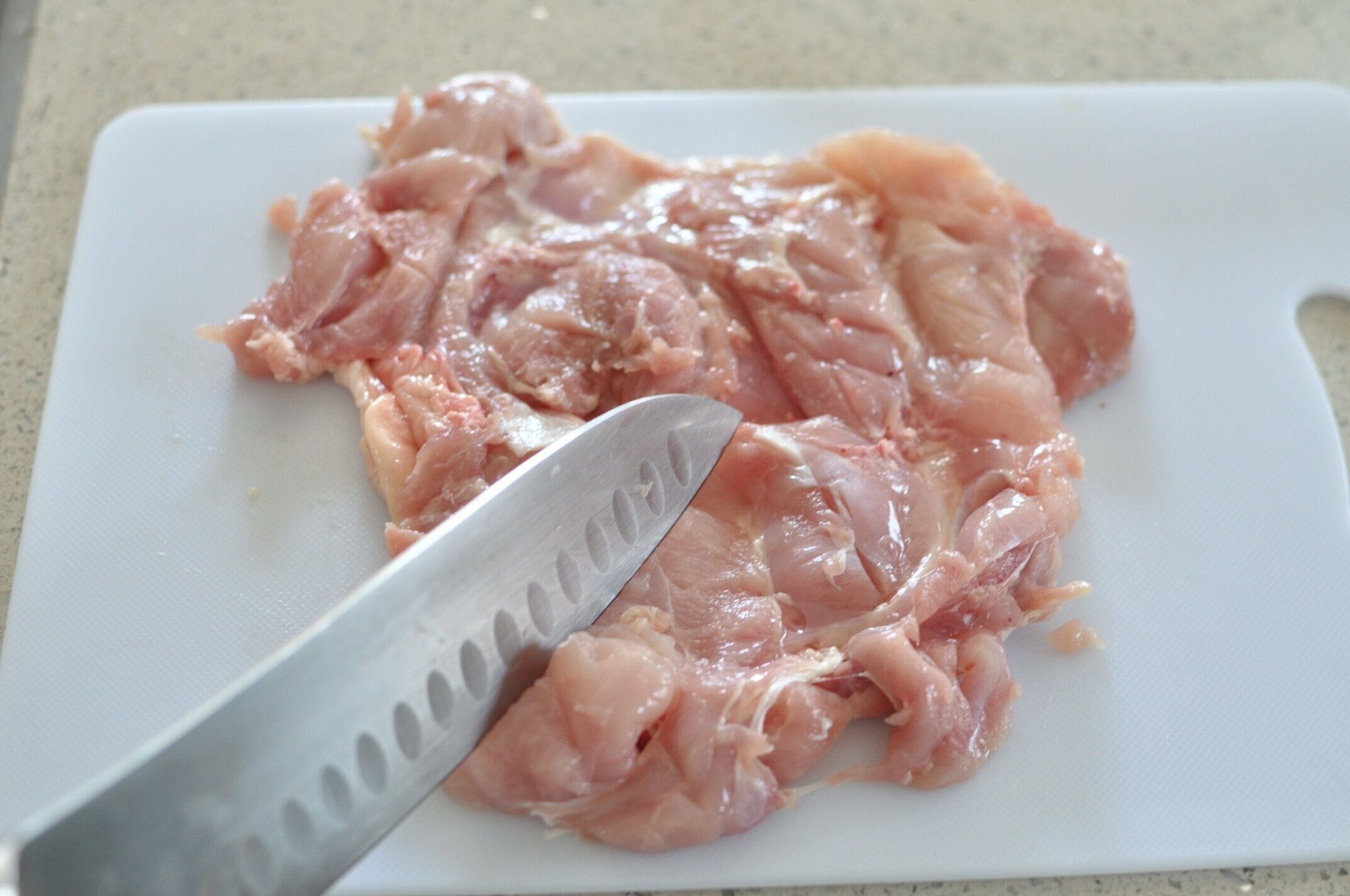 レンジでムラなく火を通すために、均一の厚みになるよう開くか、難しければ厚みのある個所に切り込みを入れます。