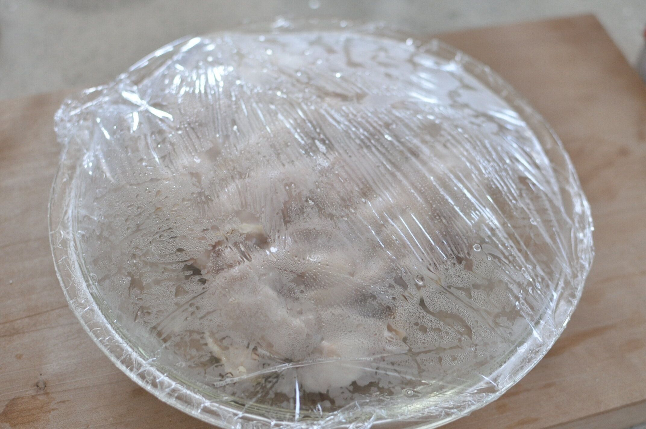 そのまま1分置いて蒸らします。耐熱皿がとても熱くなっているので、やけどに注意してください!