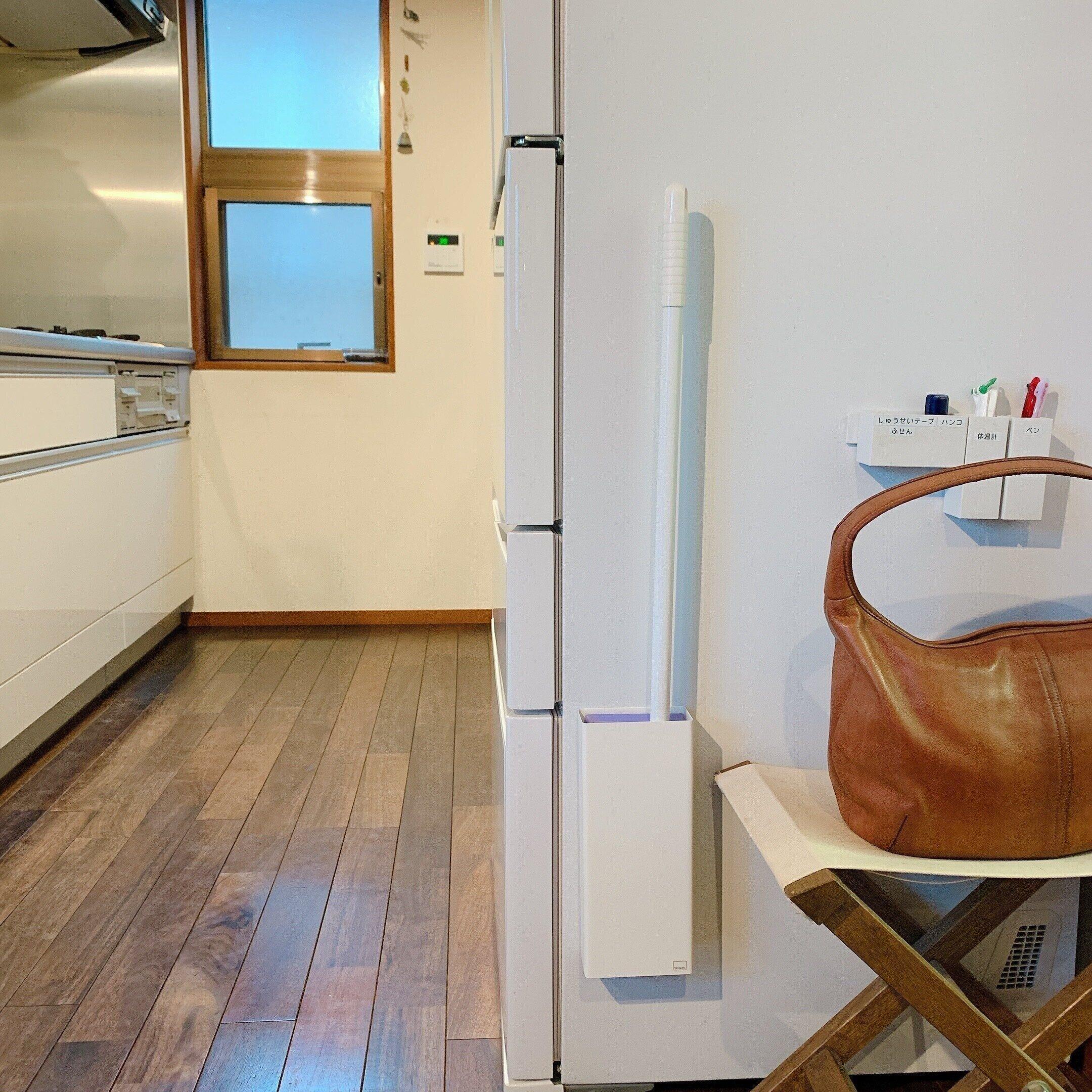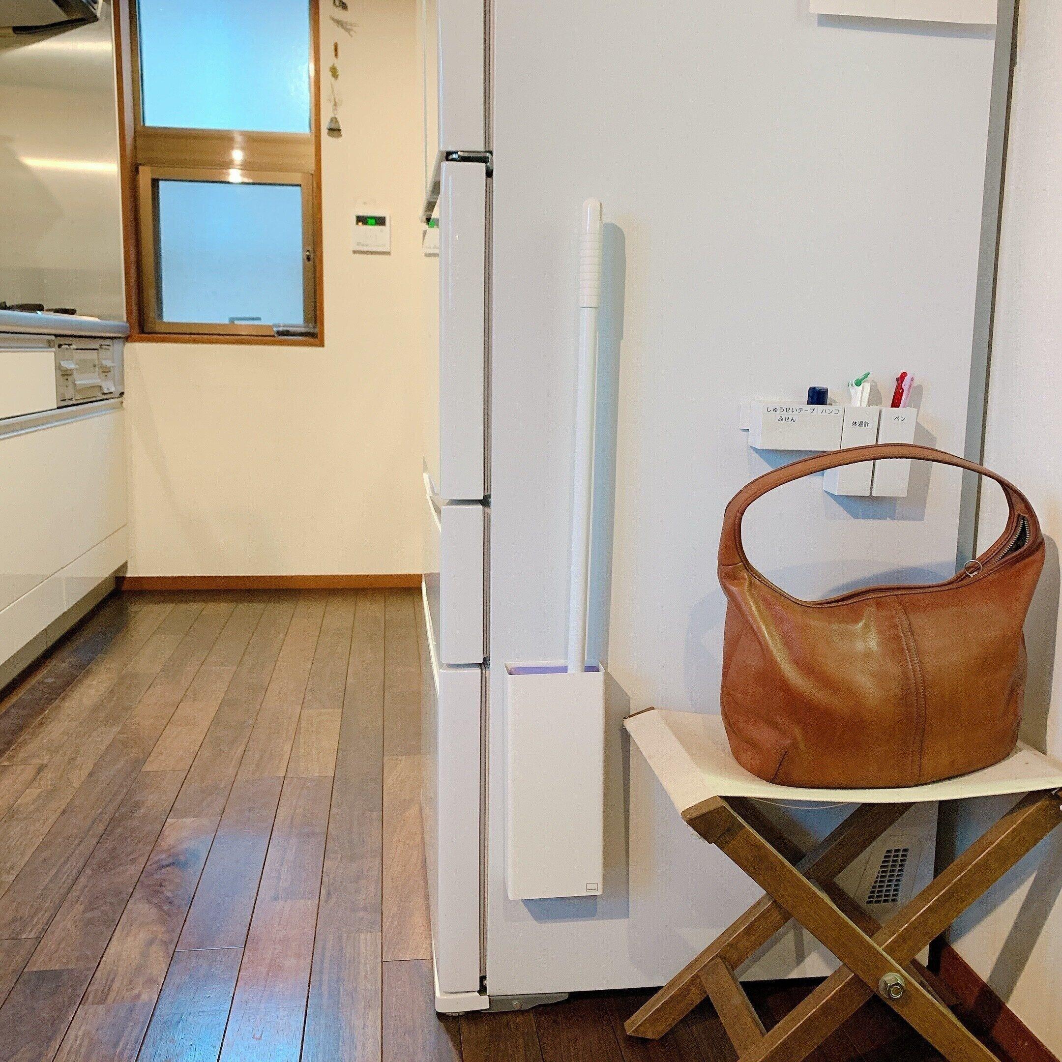 夏の季節は家族全員裸足で家中を歩き回ります。特に子どもたちは運動系の部活をしているので、汗もすごいんです。そんな我が家はクイックルワイパーは必需品です。床のベタベタが気になった時、奥の納戸から本体を取り出してきてシートをセットするのは正直面倒な作業。そうならないためにもリビングに面した冷蔵庫に空中収納しています。シートはすぐに取れるように本体の近くに収納。これで気になった時、サッと掃除ができてしまいます。