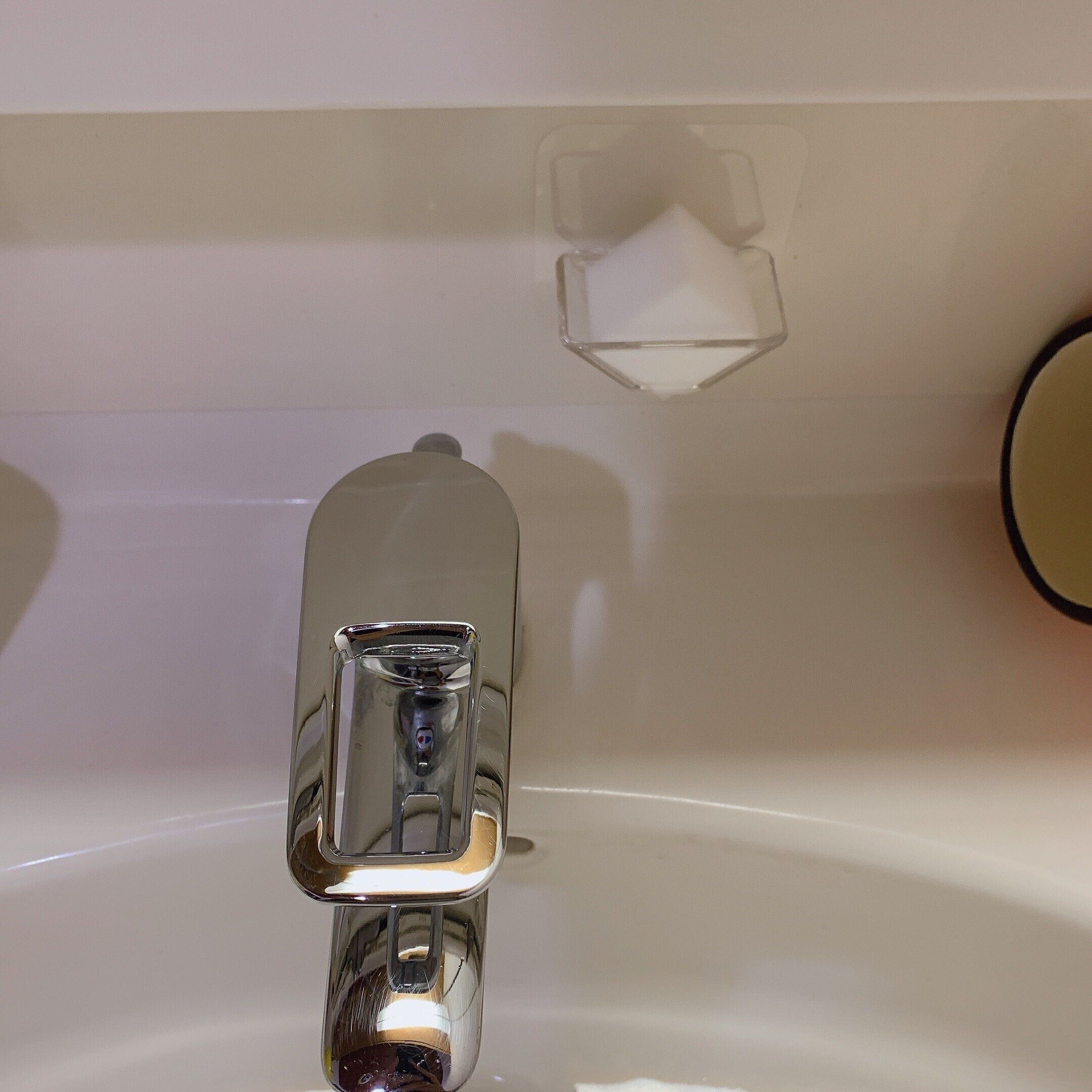 洗面台にはメラミンスポンジを出しっぱなしにしています。直置きではなく、セリアの石けんトレーという収納グッズに空中収納しています。洗面台には傷がついて使えないのでは?というかたもいらっしゃるかもしれませんが、我が家の洗面台は特に傷にはならず、むしろピカピカになるので、自己責任で使用しています。歯磨きをしながら気になった時にサッと洗面台の掃除ができてしまいます。