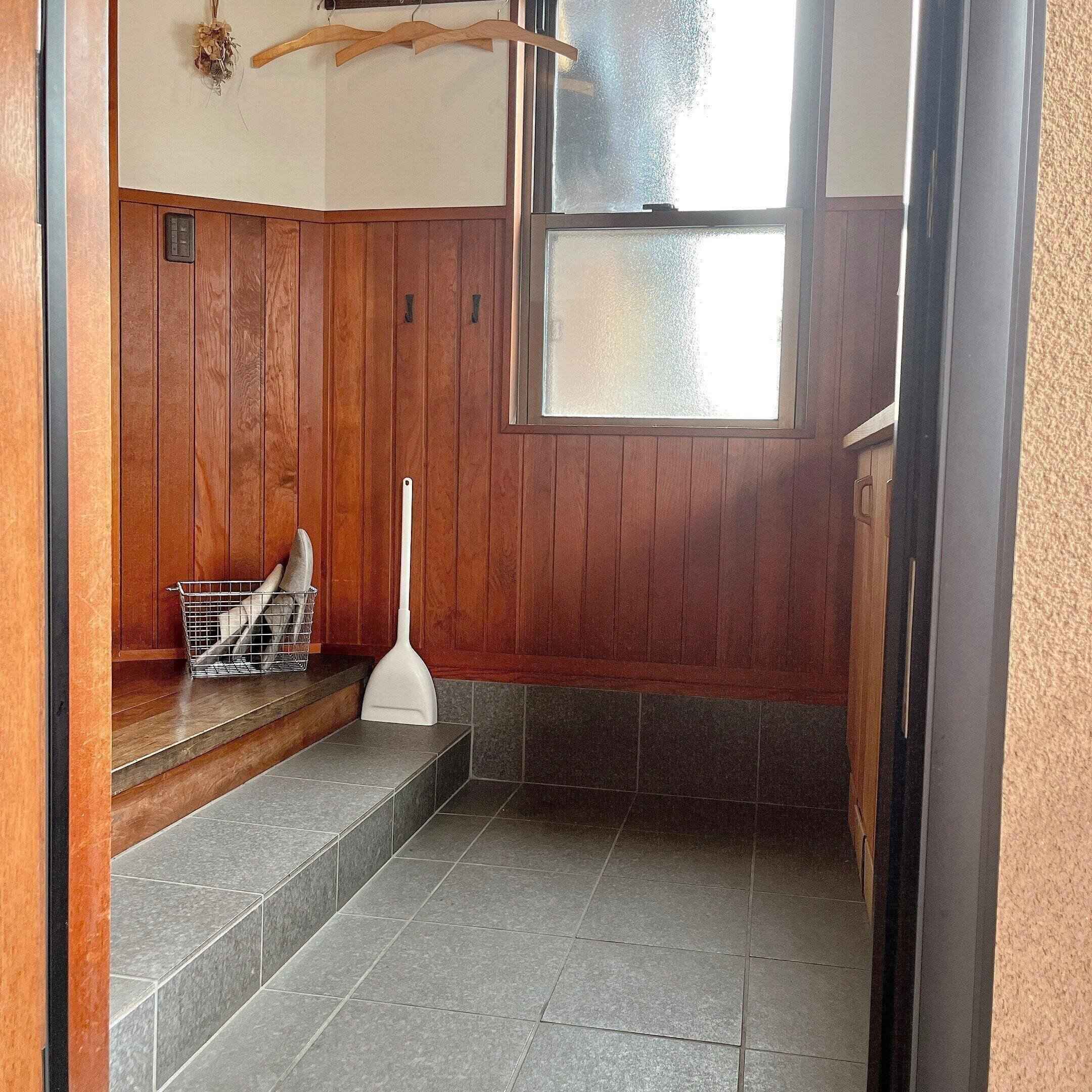 玄関は気を抜くとすぐに埃が溜まる場所。ここも気になった時にサッと掃除ができるように、ほうきとちりとりは出しっぱなしにしています。ここで採用した掃除グッズは、自立もしてデザインもシンプルな物。ブラシ部分は角度がついているので、隅々まで埃を取ってくれます。