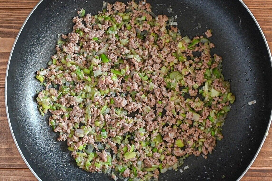 (2)フライパンにサラダ油を入れ、合いびき肉と長ねぎを炒める。