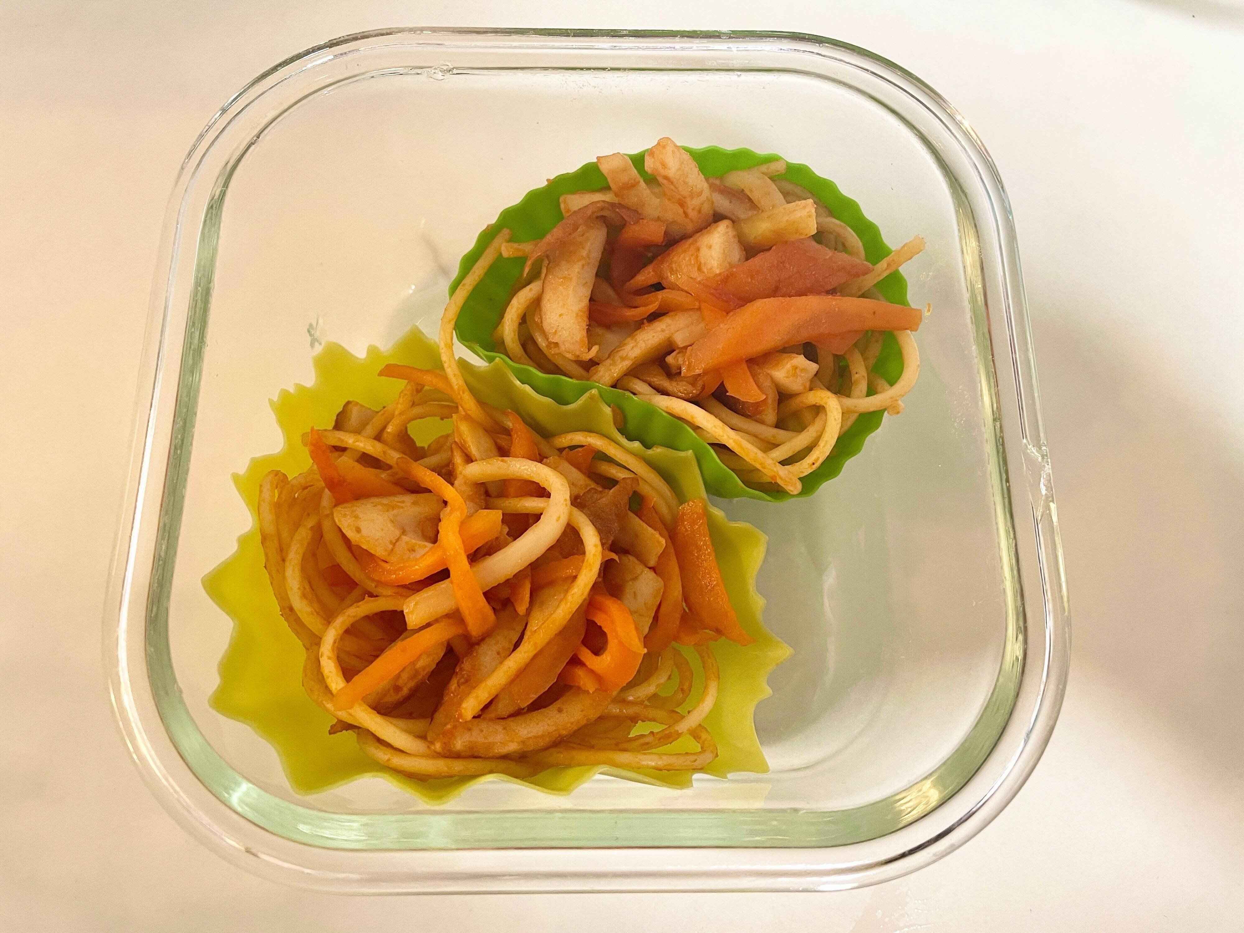 先日私がつくったのは、ブロッコリーの茎とにんじん、ちくわを入れてナポリタンにしました。