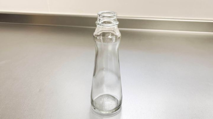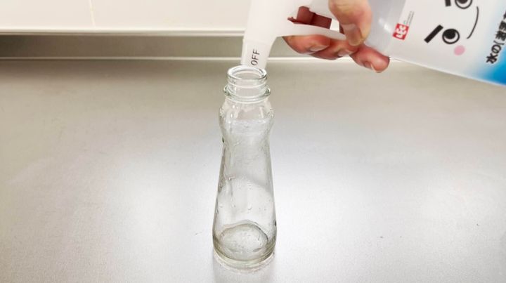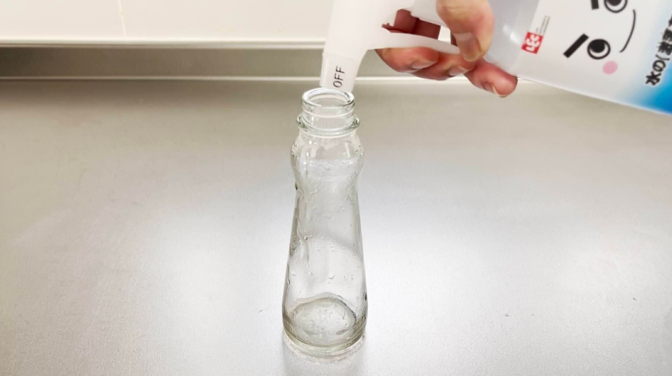 使い方は簡単です。瓶の中にアルカリ電解水を吹きかけるだけでOKです。すると、瓶の中の油が乳化して白く変化します。その後、仕上げに少量の食器洗剤を入れた水で瓶を洗い流すだけで、瓶の内部の油汚れが取れてきれいになります。