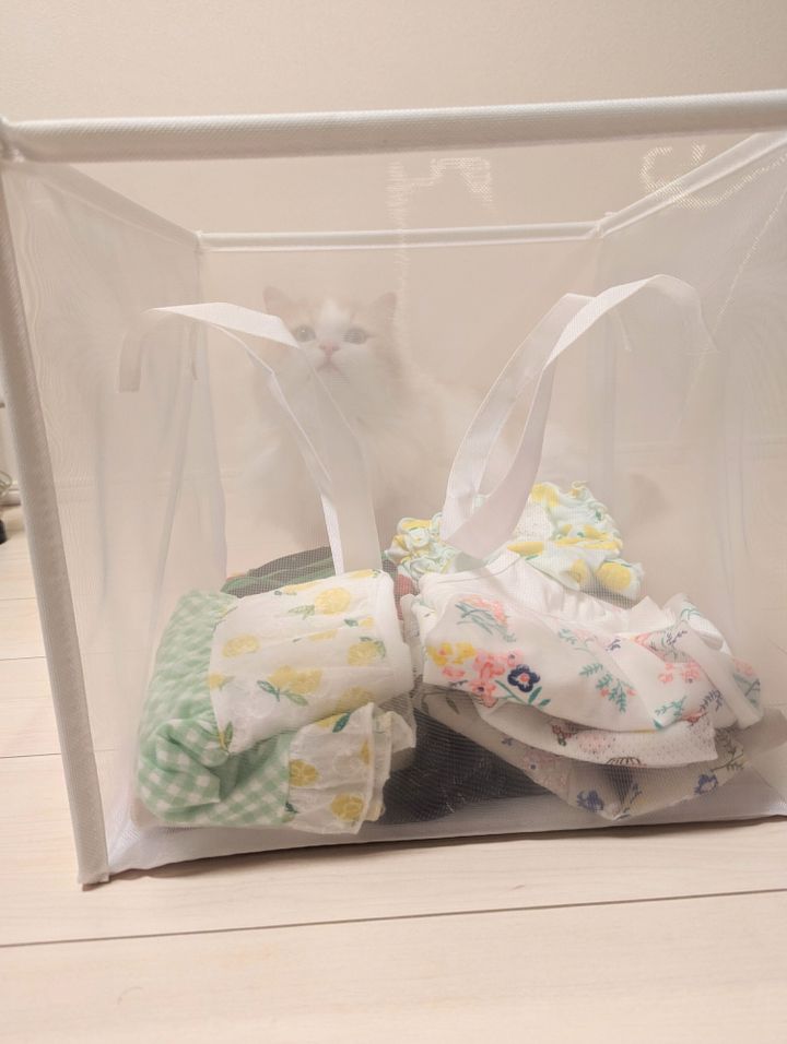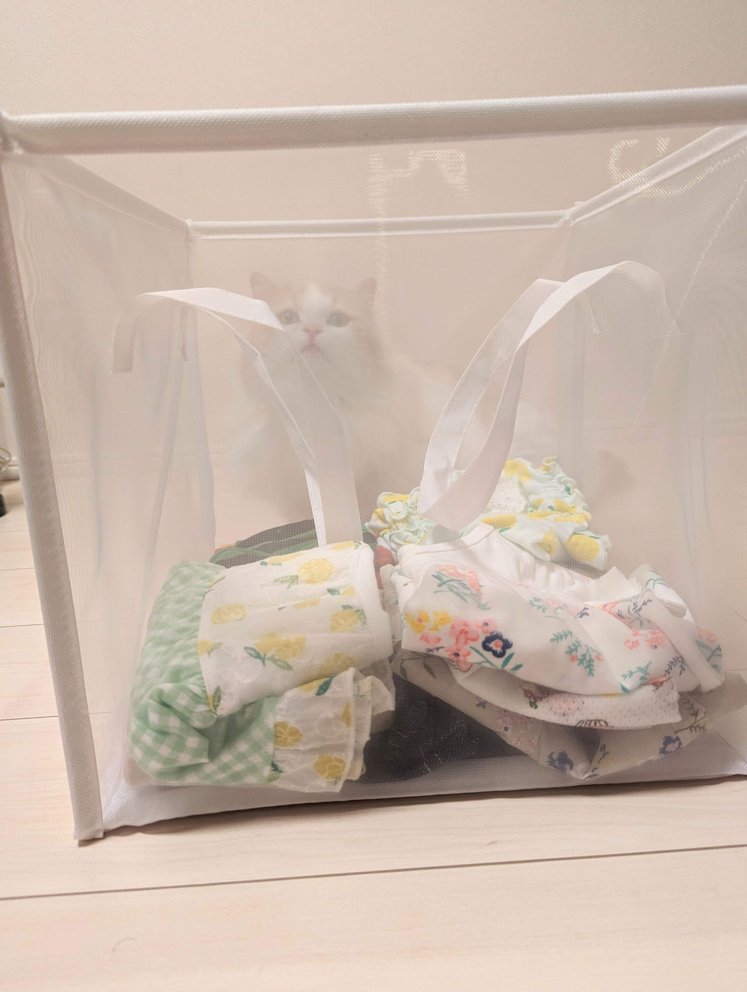 写真は早速、1・2・3の仕事を全てこなしてくれたメッシュカゴさんと、手出しできずに「あれぇ?」というような表情の猫です。効率よく家事をこなすことが出来て、大満足です!