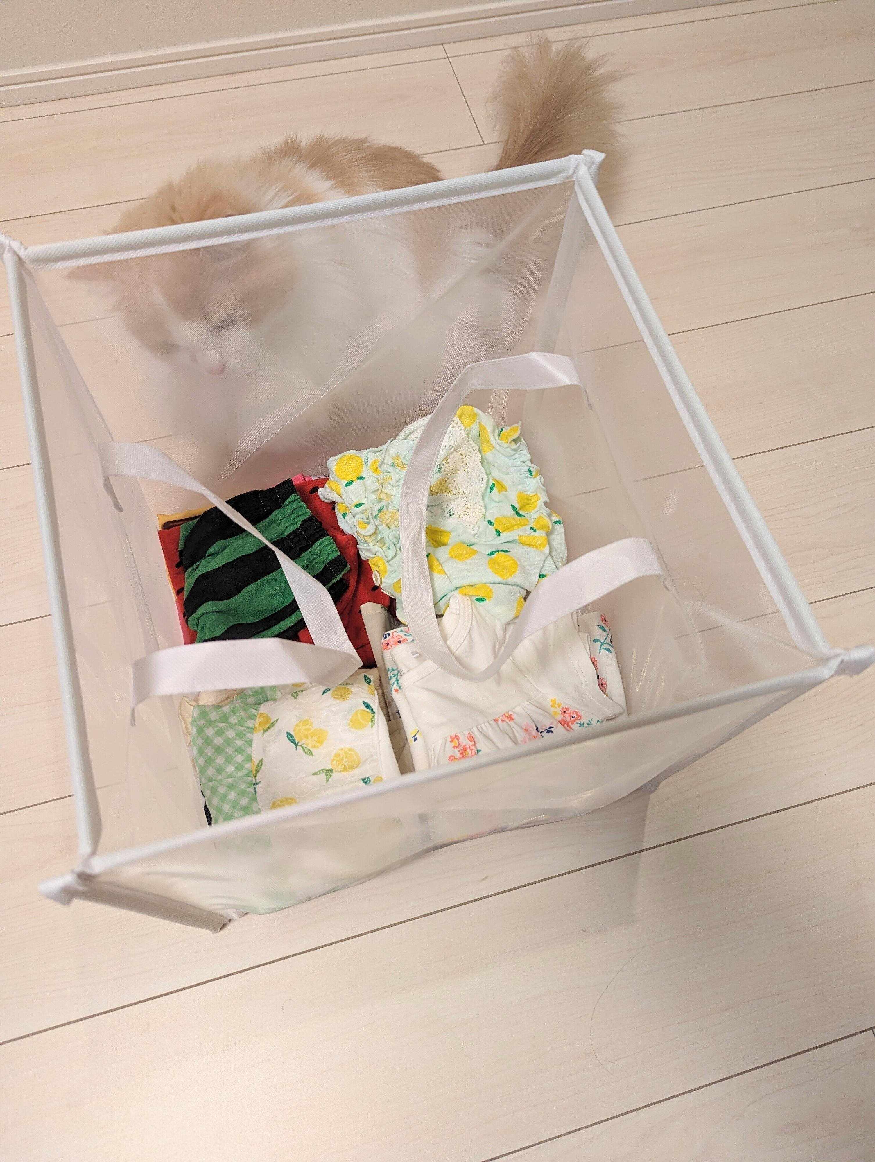 2は、せっかく畳んだのに、こちらも上記2名のデストロイヤーが何処からともなく現れて、ぐっしゃぐしゃにして去っていくのです。こちらも畳んですぐにクローゼットへしまえれば良いのですが、そうはいかない時もありますよね。仕事が水の泡にならない為の施策です。