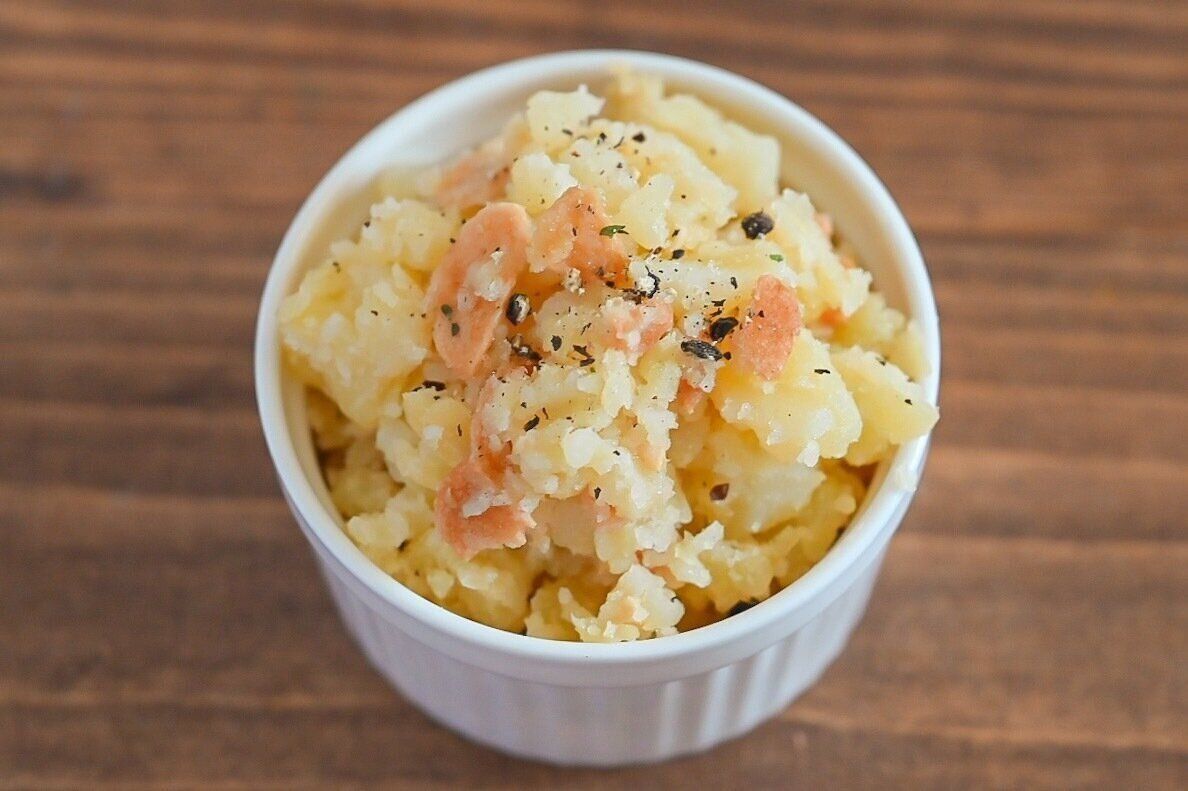 (2)牛乳、「なんでもガーリック」を合わせてマッシャーでつぶし、粗びき黒こしょう(※材料外)をかけて完成。
