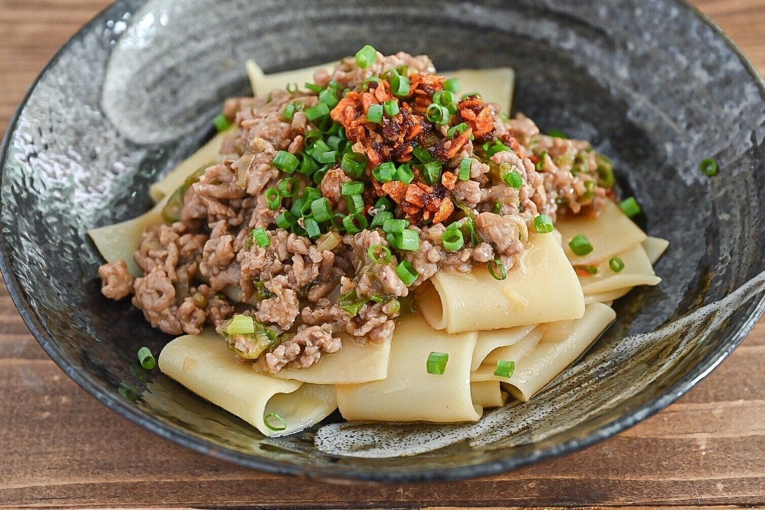 ビャンビャン麺は中国で昔から食べられているベルト状の幅の広い麺です。