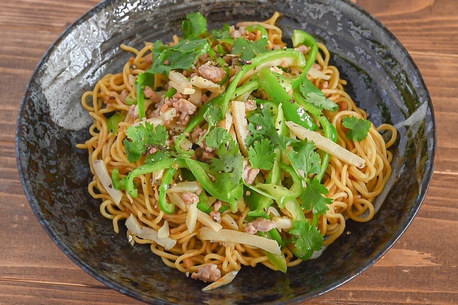 (8)皿に麺、豚ひき肉、(3)を盛り、お好みでパクチーをのせて完成。