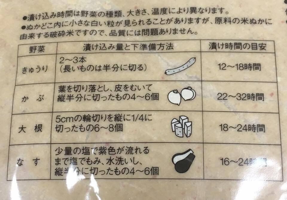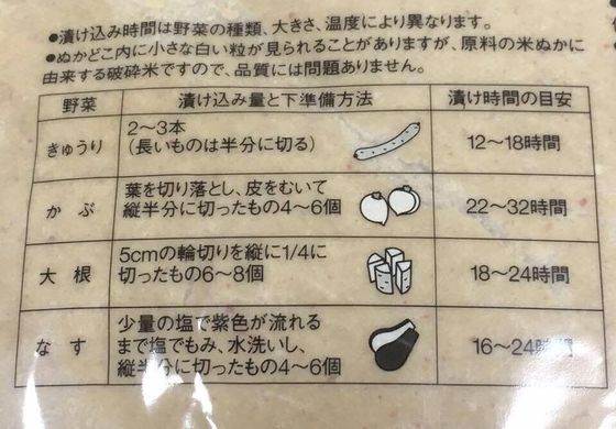 漬け時間の目安が袋に記載されているので、初めて漬ける場合も漬かりすぎる心配はありません。