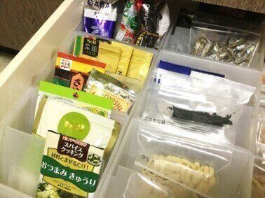 カラフルな袋類は視界に入らない定位置にするだけでスッキリ感が増します。