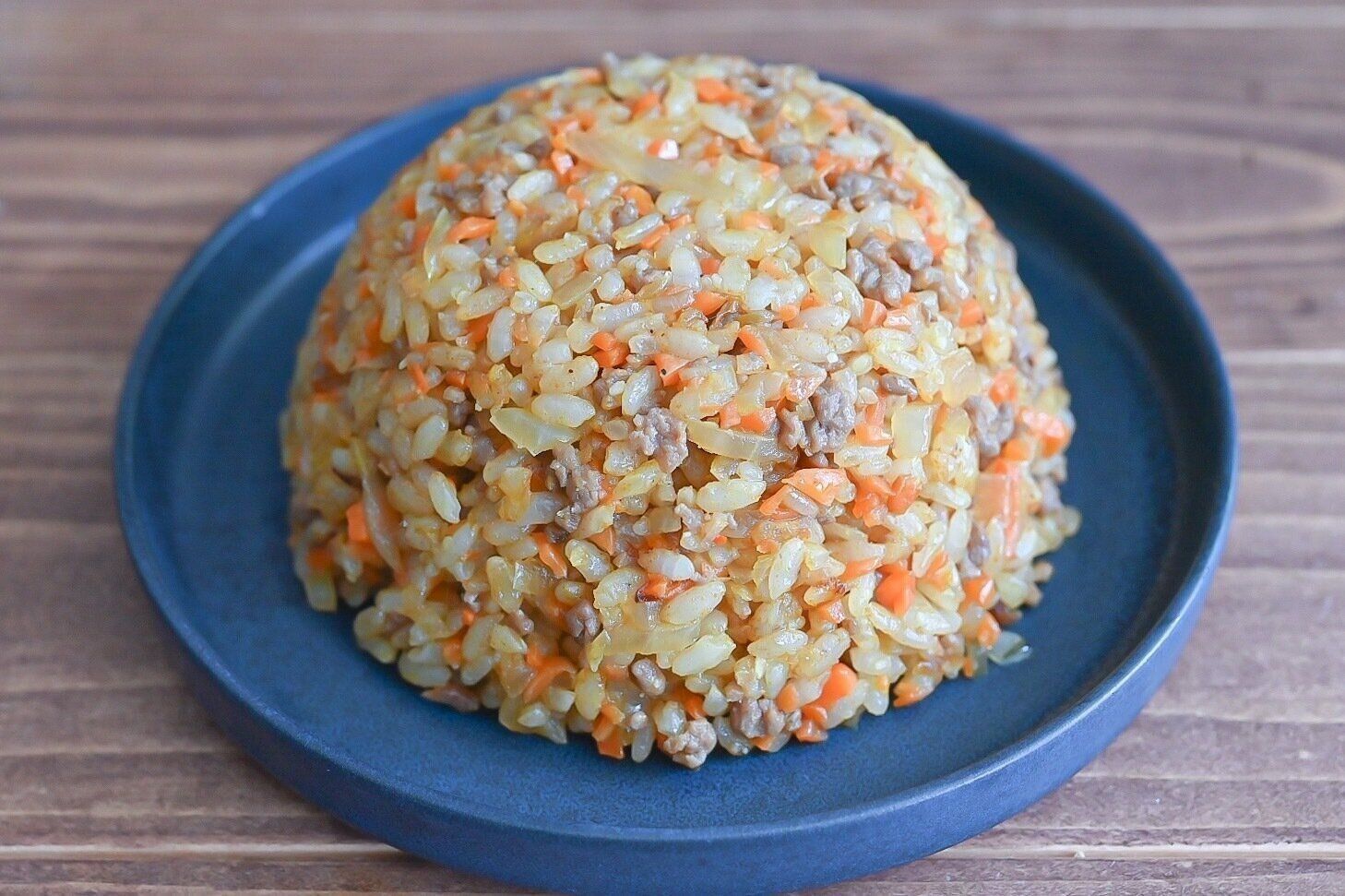 (4)合いびき肉を加えて色が変わるまで加熱し、ご飯を加えてほぐしながら炒める。
