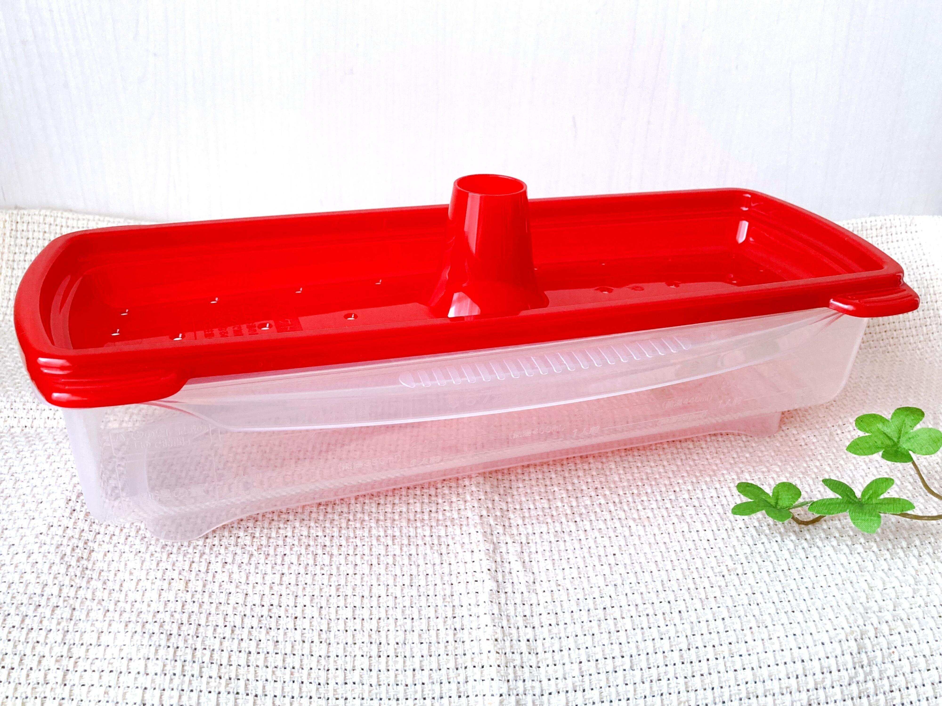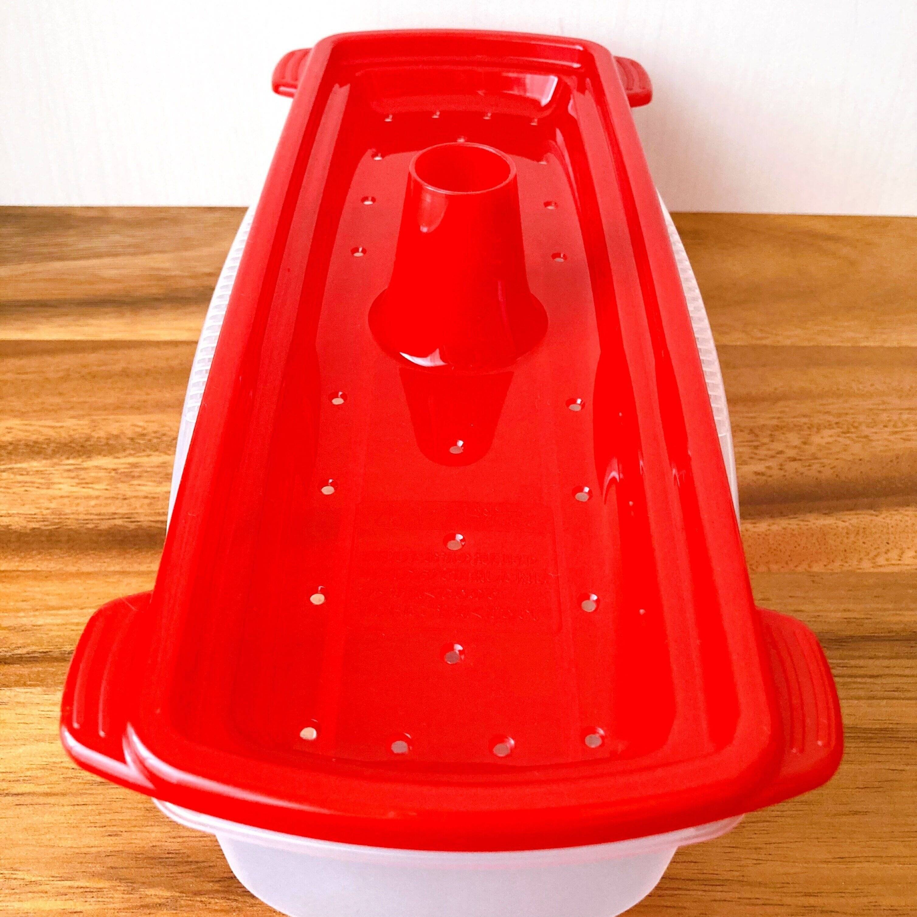 一般的なパスタ用電子レンジ調理器はふたがフラットなものが多いですが、この商品には真ん中にえんとつのような突起があります。これがおいしくなるための大事な役割を果たしています。