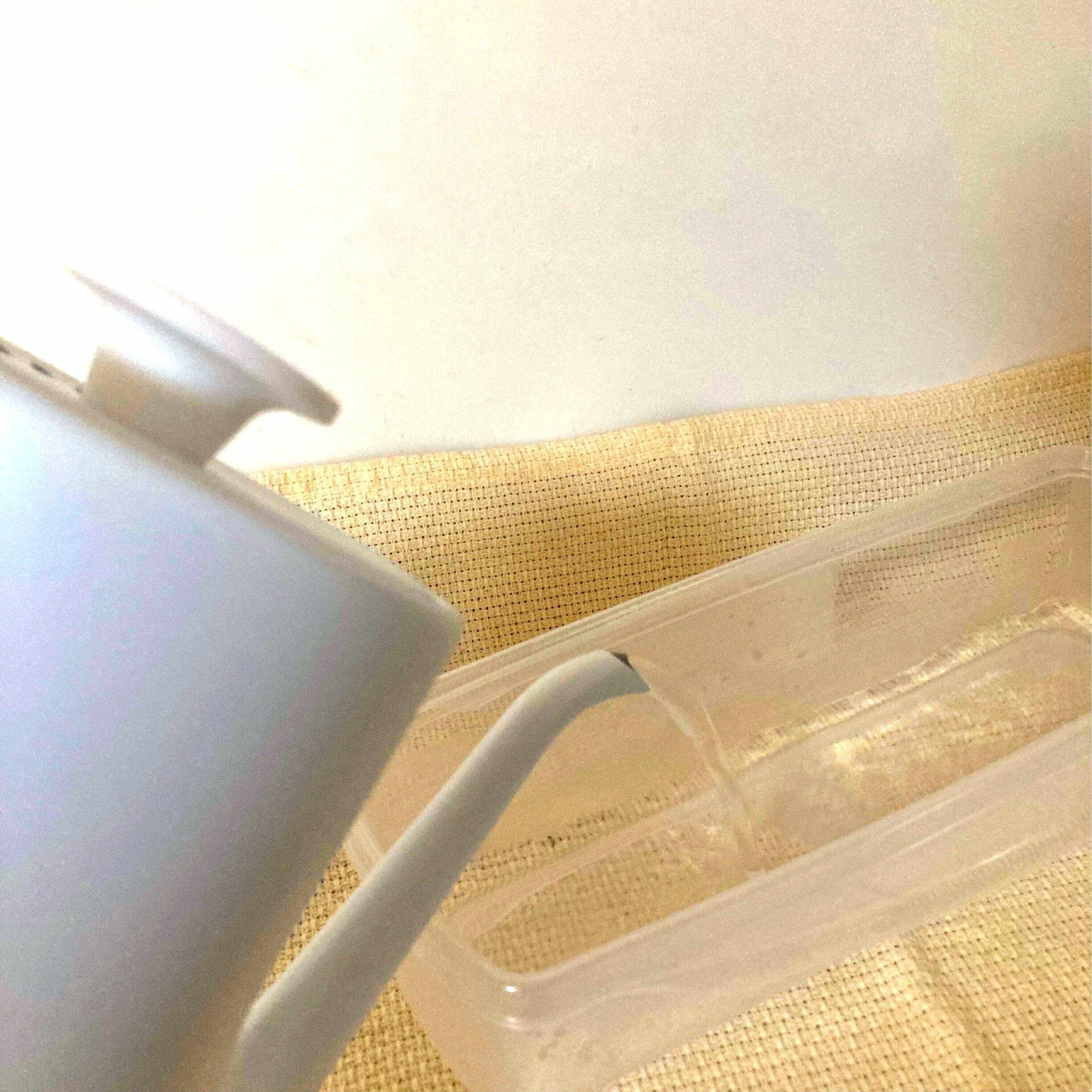 下の透明な容器に熱湯と塩、パスタを入れてふたを閉めて電子レンジで加熱します。