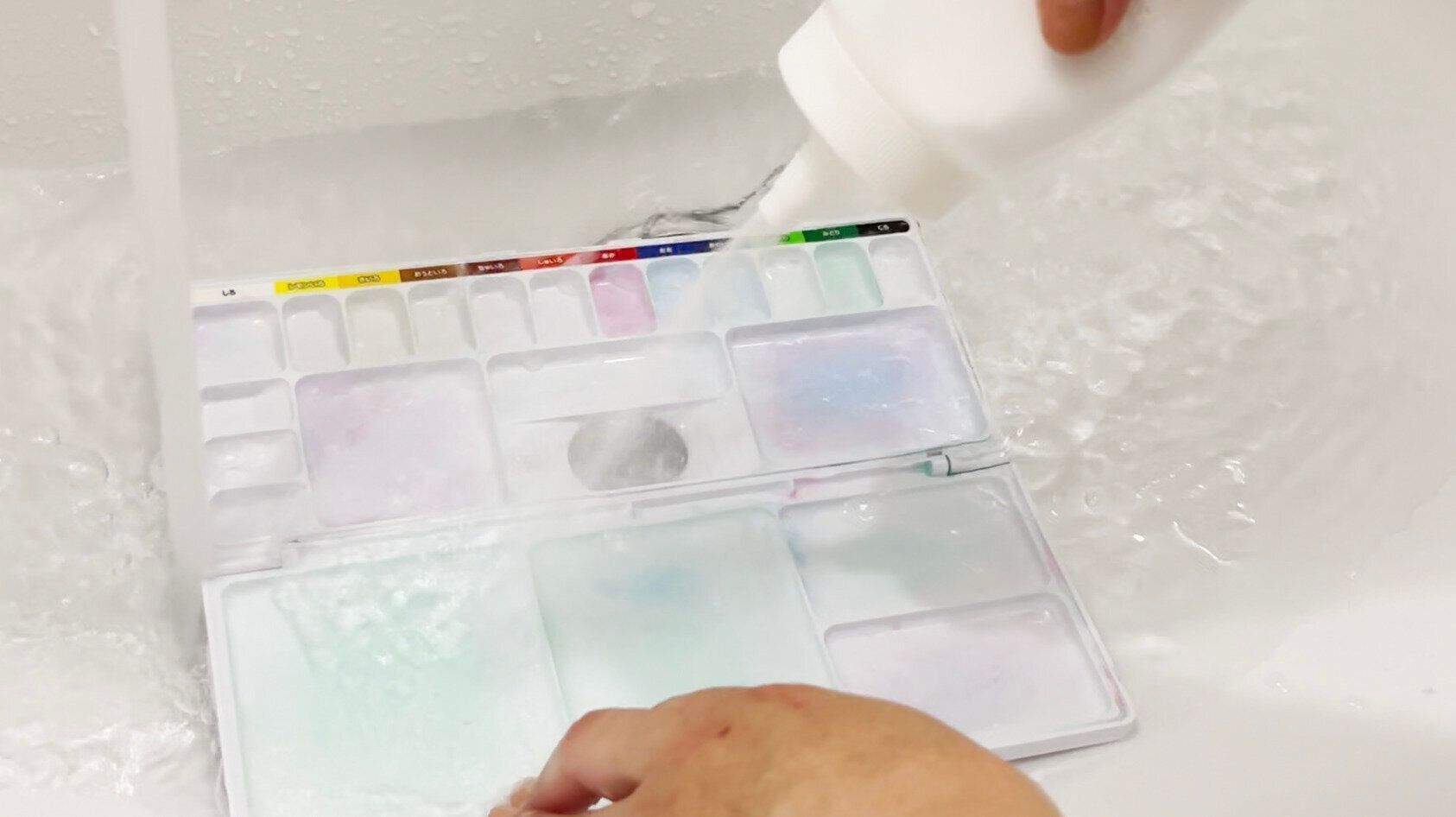 硬いブラシやメラミンスポンジで擦ると、微細な傷がついてしまい、その傷に絵の具汚れが入り込んでしまい、逆に汚れが取りにくくなってしまうことがあります。パレットをキレイにするためには、重曹水を使った浸け置きが効果的です。