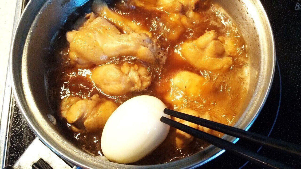 3.フタを取ってゆで卵、食べやすく切った長ねぎを加えます。途中、上下を返しながら煮ていき、煮汁が少なくなって食材に煮汁の色が付いたら火を止めます。