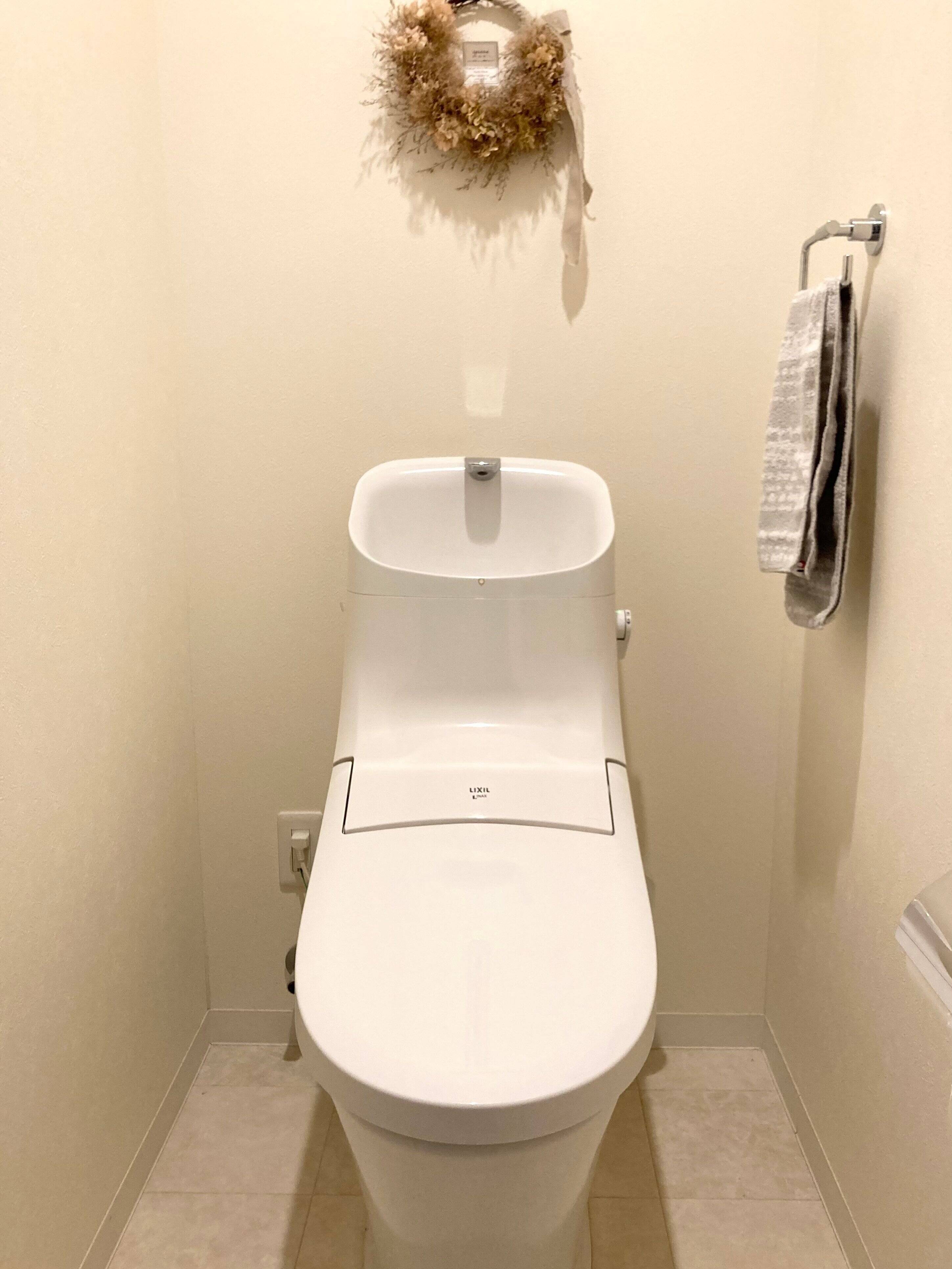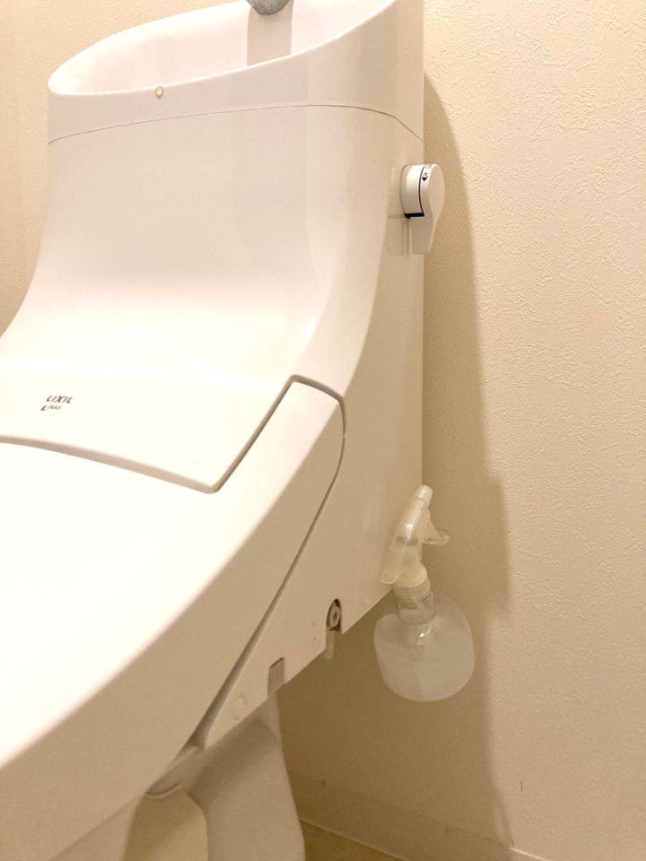 掃除のハードルを下げるためにトイレタンク横にセスキスプレーを配置。毎朝トイレを利用するタイミングで掃除しています。スプレーをしてサッと拭くだけなので、1分程で完了します。タンク横は正面から見て死角になるため来客があっても気になりません。スプレーはセリアのフックに掛けてサッと取り出せるようにしています。