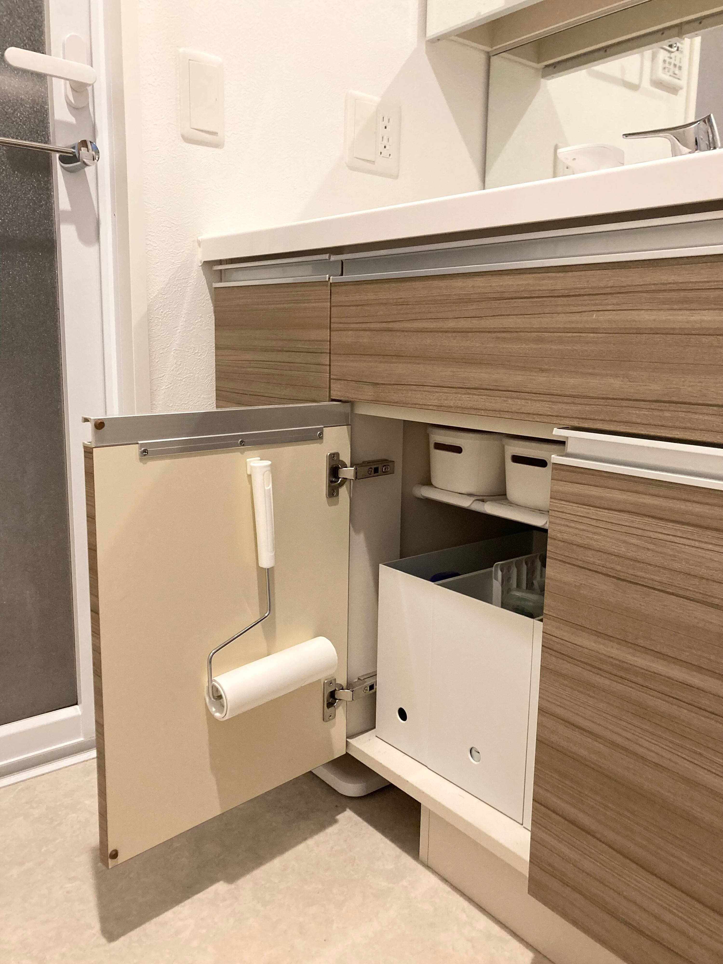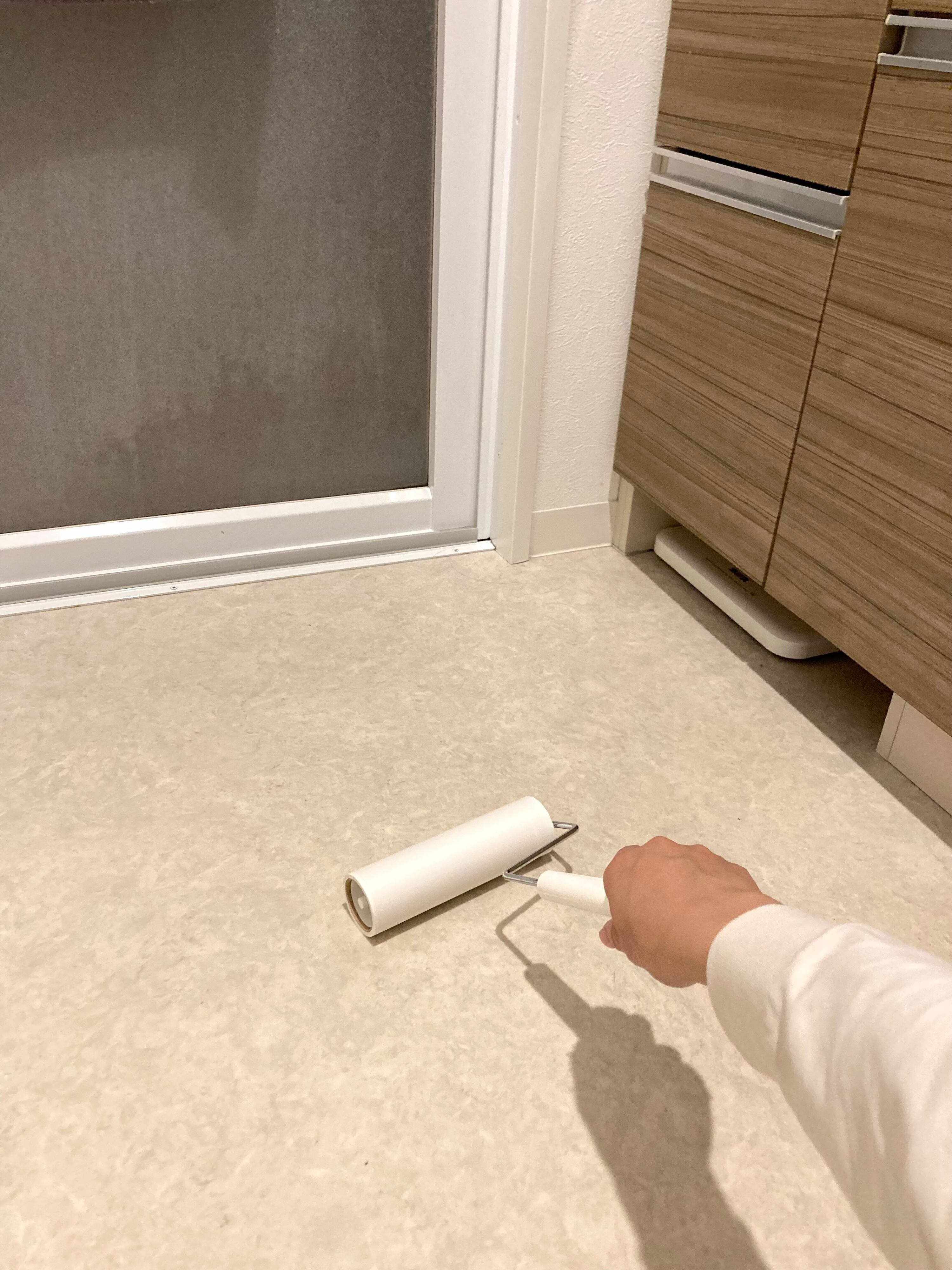 脱衣所で髪を乾かした後は、粘着クリーナーをサッとかけて退出します。こちらは10秒ほどで完了。粘着クリーナーは取り出しやすいように、洗面台の扉裏に掛けて収納しています。